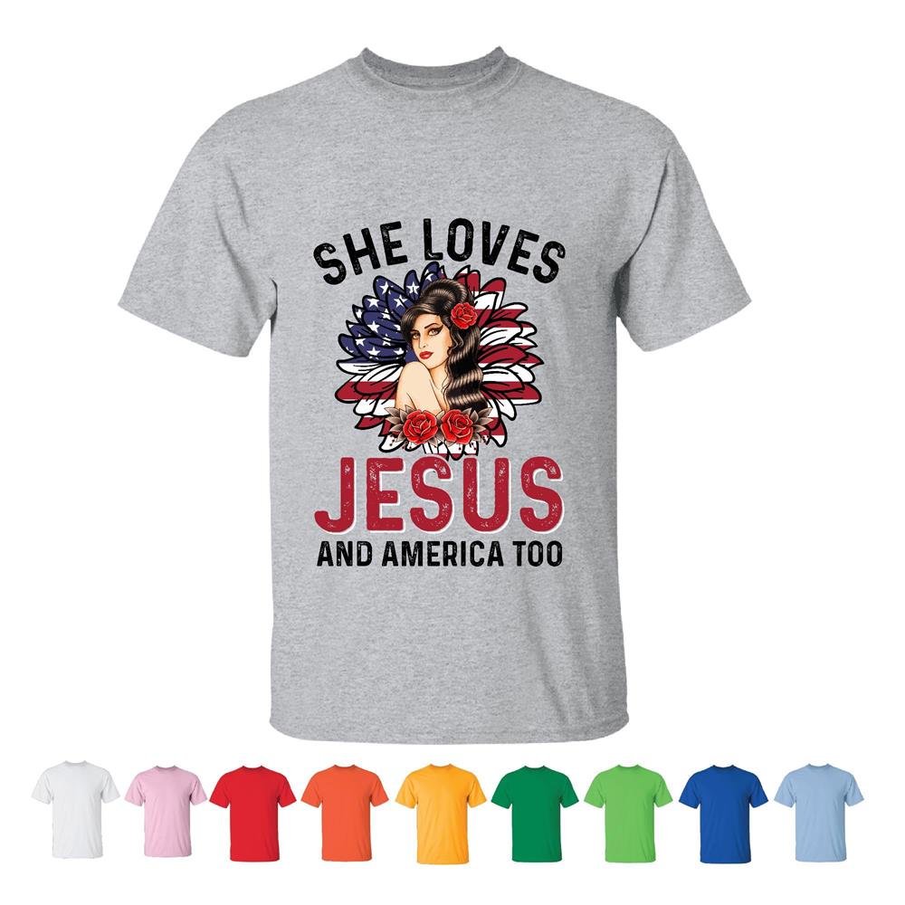 She loves Jesus and America too from Christian American God lover Men Women White Gray T shirt