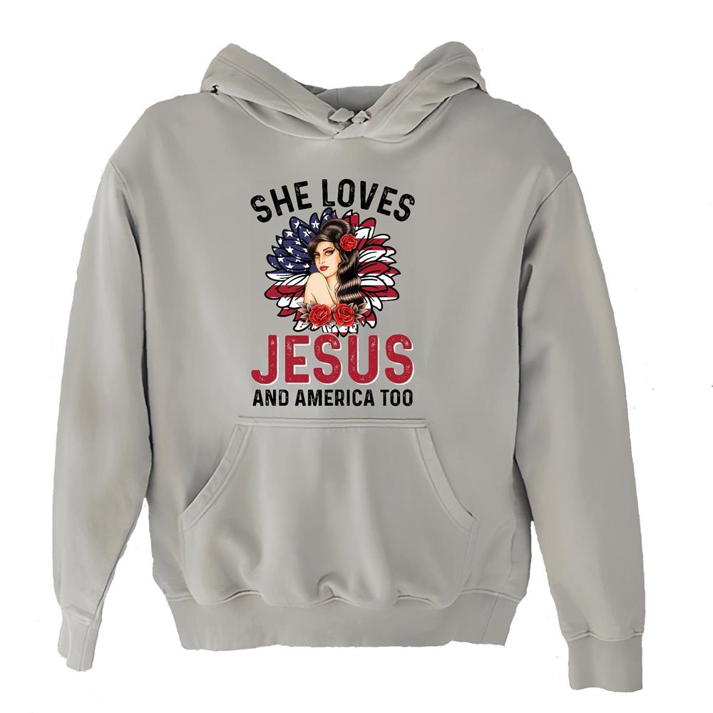 She loves Jesus and America too from Christian American God lover Gray and Muticolor Unisex Hoodie