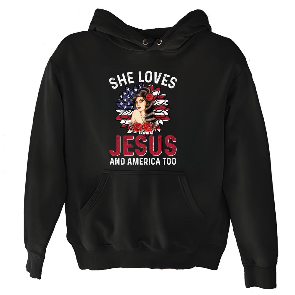 She loves Jesus and America too from Christian American God lover Black and Muticolor Unisex Hoodie