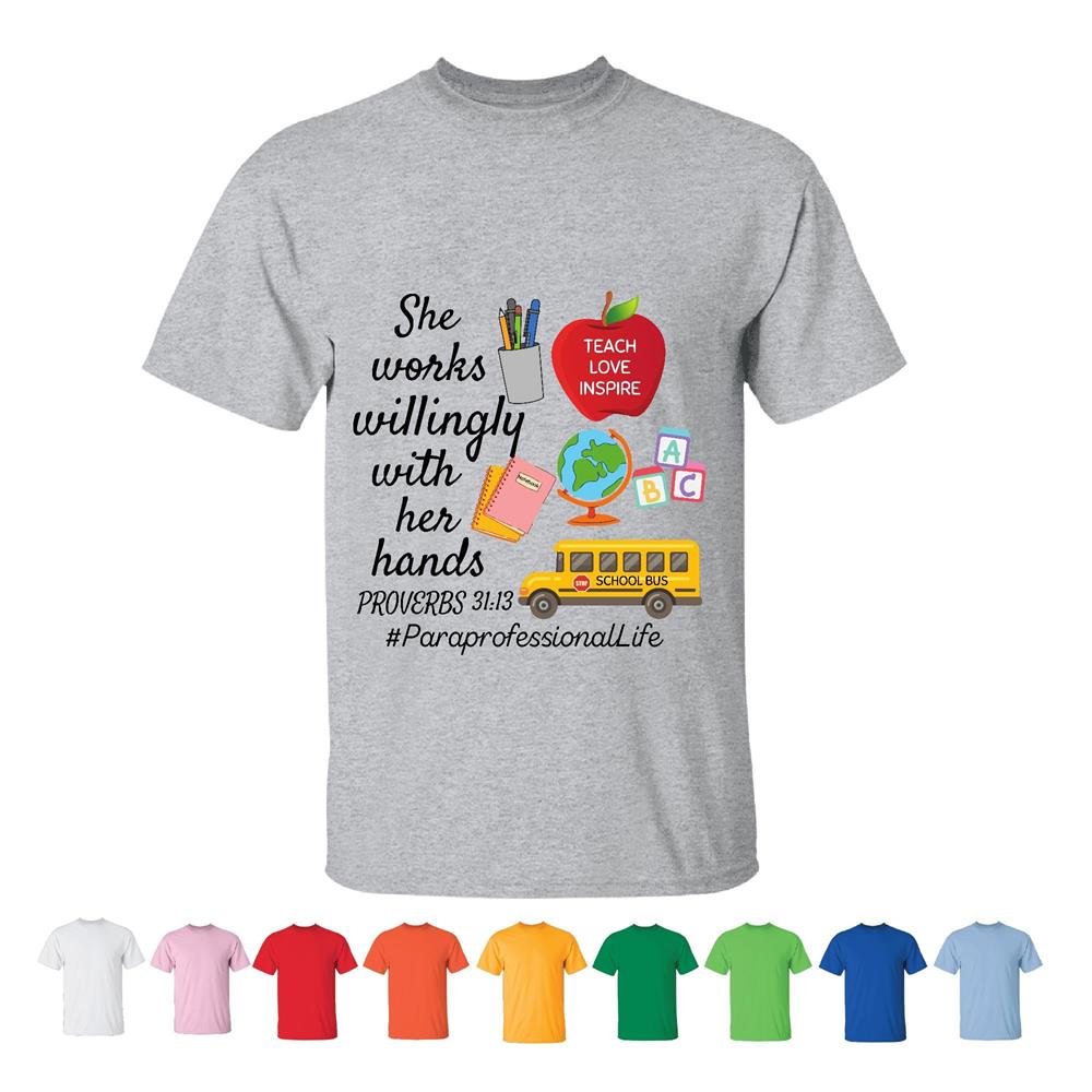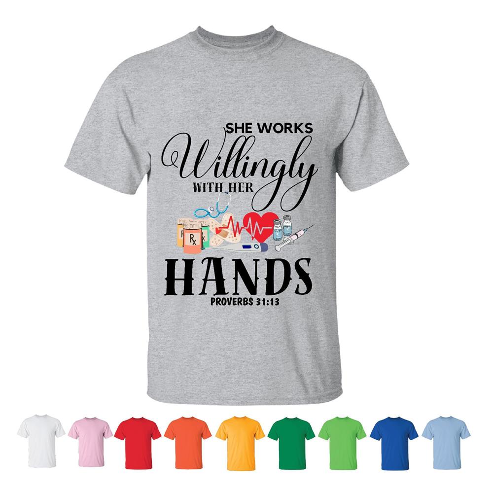 She Works Willingly with Her Hands Proverbs 31 13 Essential Worker RN Gift Idea for Nurses Men Women White Gray T shirt