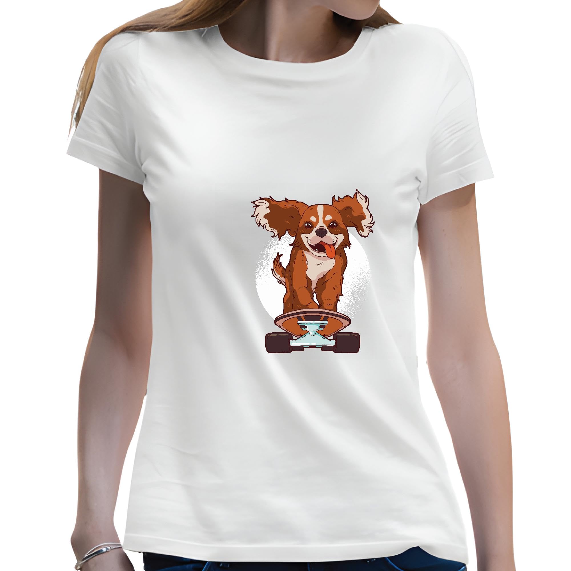 Skateboarding Gift for Dog Lovers King Cavalier Pup Having Fun Men Women White Gray Multicolor T shirt