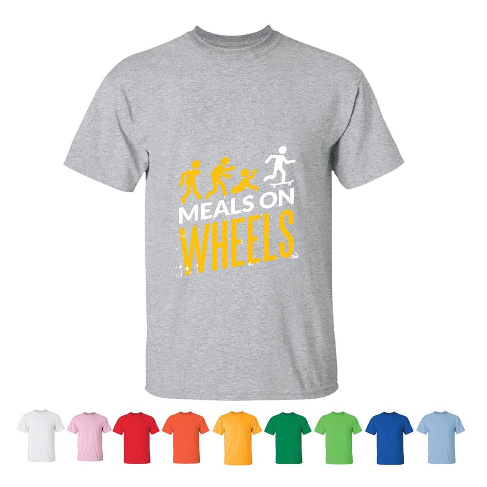 Skateboarding Gift for Zombie Fans Meals On Wheels Label Man Figure Running Away Men Women White Gray T shirt