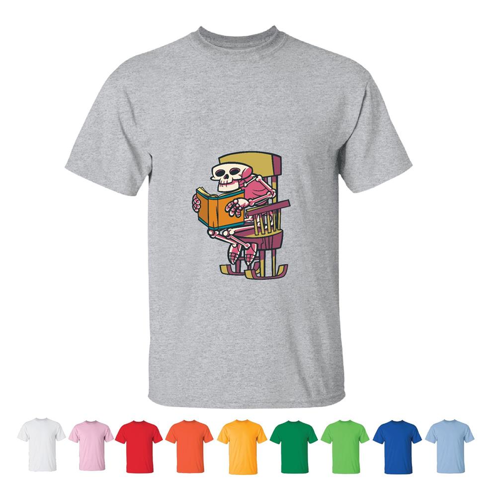 Skeleton Rocking Chair Reading Book Gift for Kids and Adults Men Women White Gray T shirt