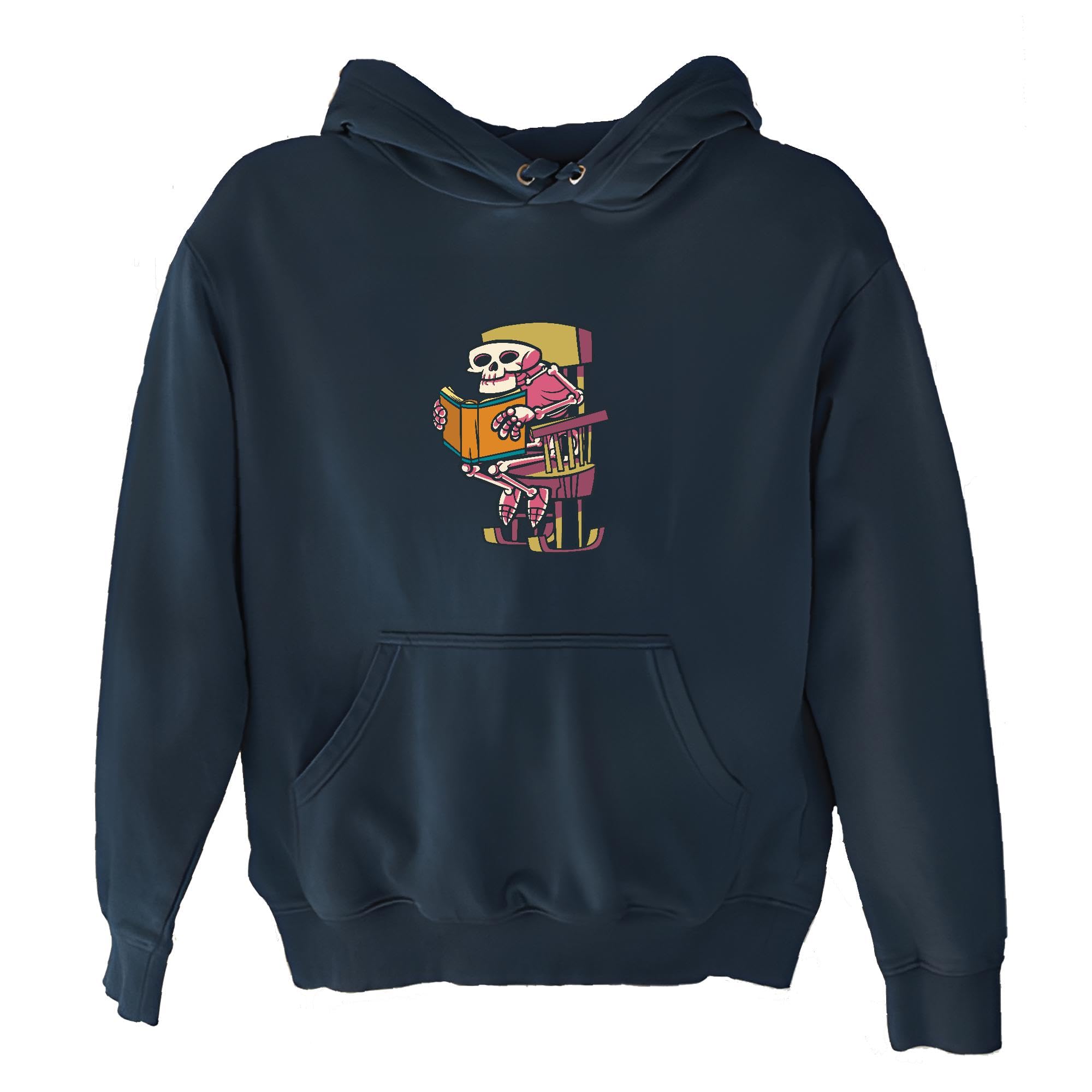 Skeleton Rocking Chair Reading Book Gift for Kids and Adults Navy and Muticolor Unisex Hoodie