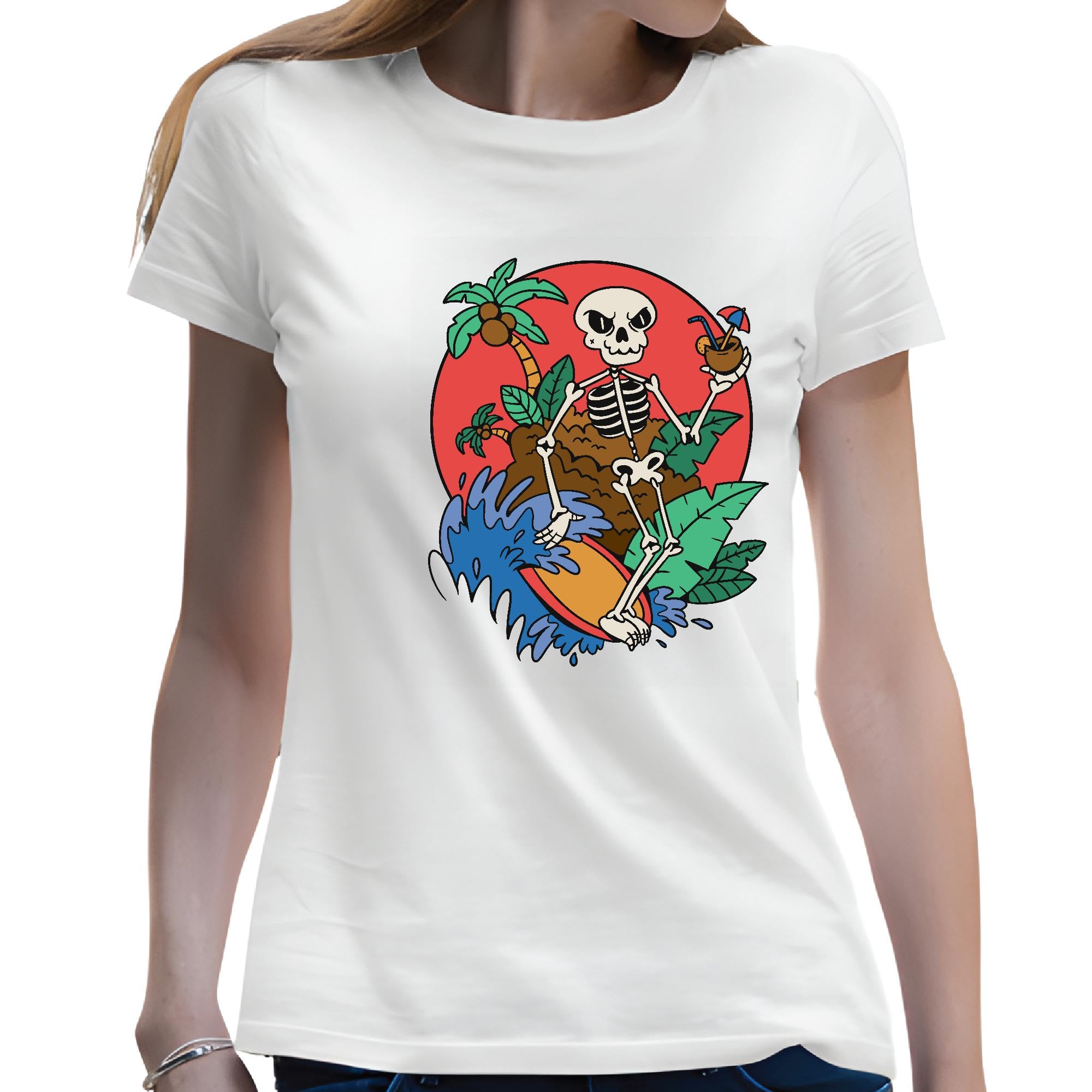 Skeleton Surfing Gift Ideas for Surfers and Beach Lovers Men Women White Gray Multicolor T shirt