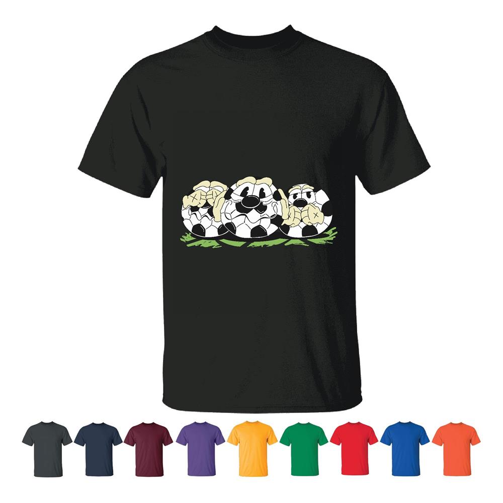 Soccer Ball Cartoon Gift for Kids Three Cartoon Soccer Balls Covering Their Eyes Ears and Mouth Men Women Black T shirt