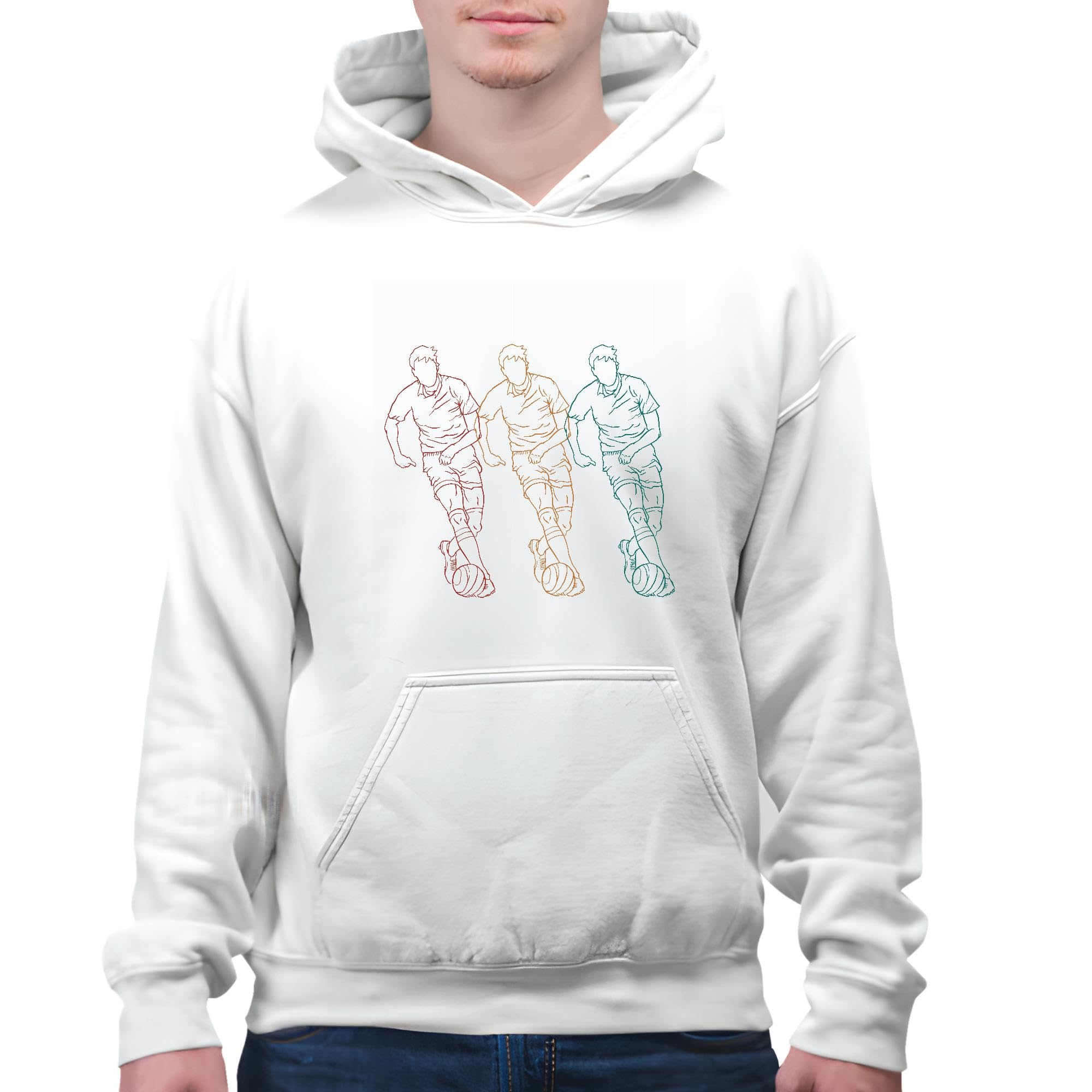 Soccer Player Gift Sport Line Art Three Players in Different Colors for Soccer Fans White and Muticolor Unisex Hoodie