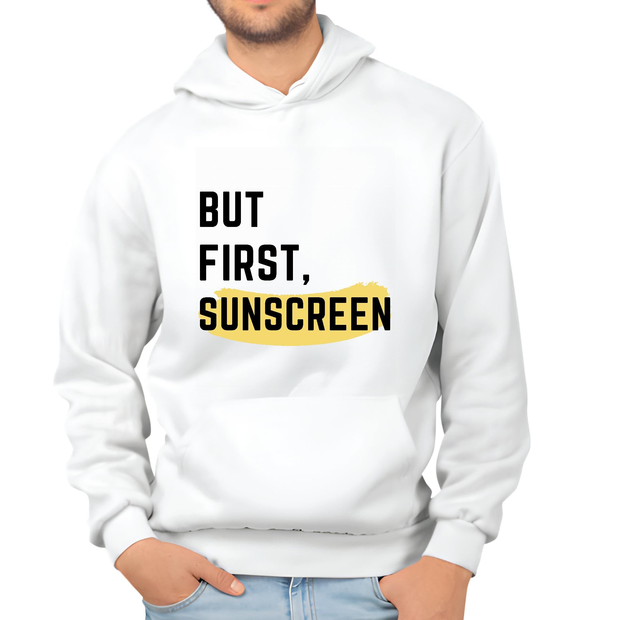 Sunscreen Gift for Skincare Addict But First Sunscreen Saying White and Muticolor Unisex Hoodie