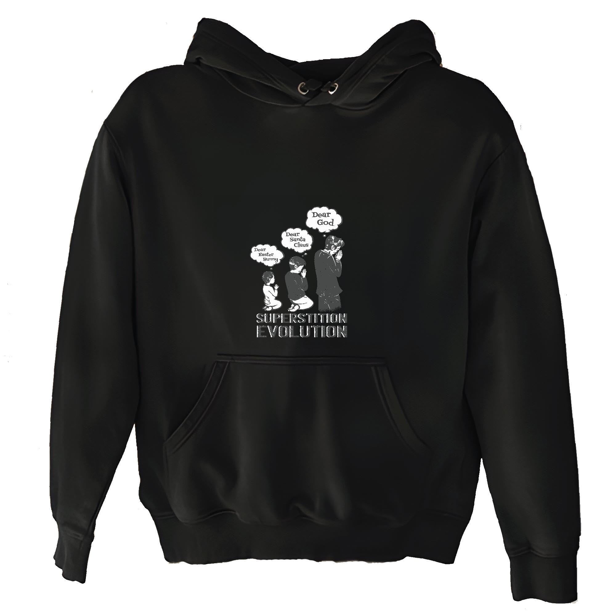 Superstition Evolution Praying to Easter Bunny Santa Claus and God Gift for All Ages Black and Muticolor Unisex Hoodie