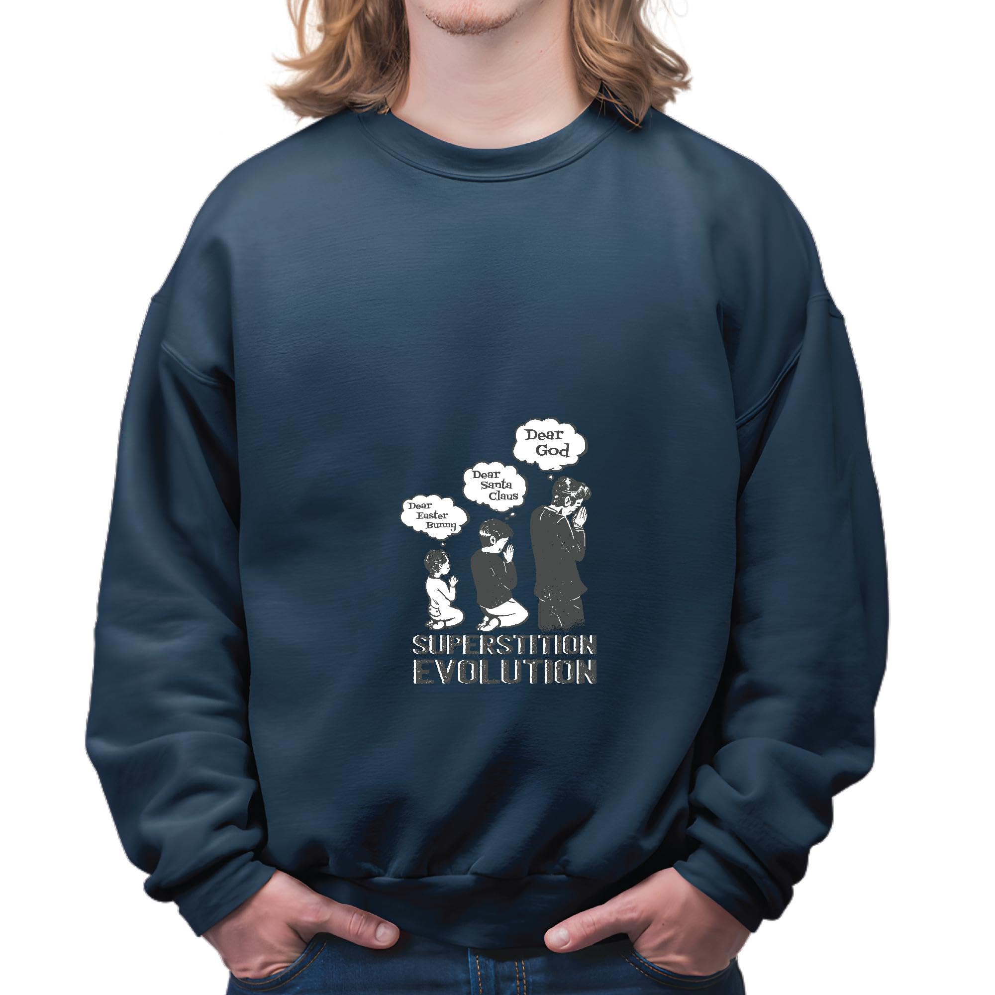 Superstition Evolution Praying to Easter Bunny Santa Claus and God Gift for All Ages Navy Muticolor Unisex Sweatshirt