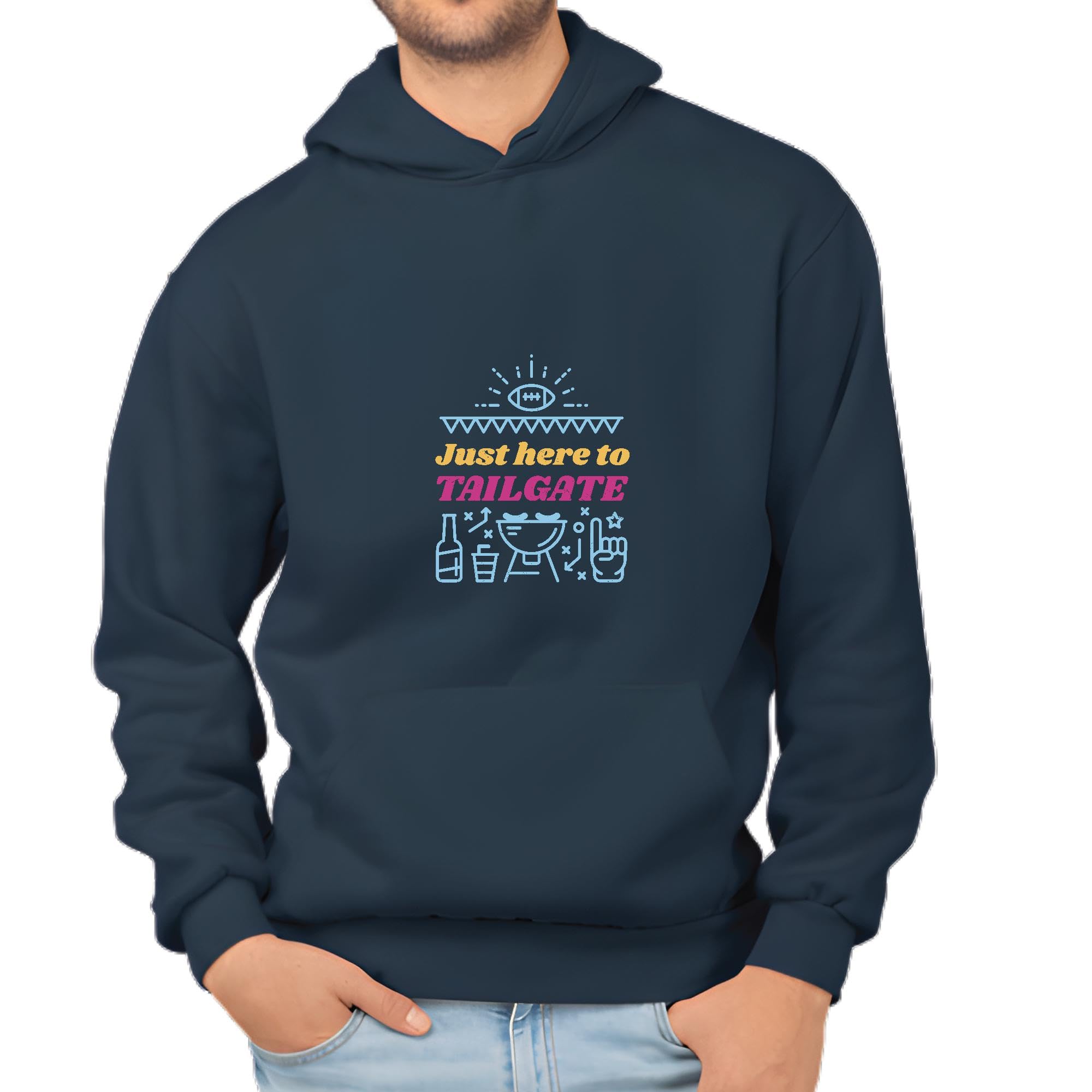 Tailgating Gift for Football Fans Just Here To Party with Drinks and Food Quotes Navy and Muticolor Unisex Hoodie