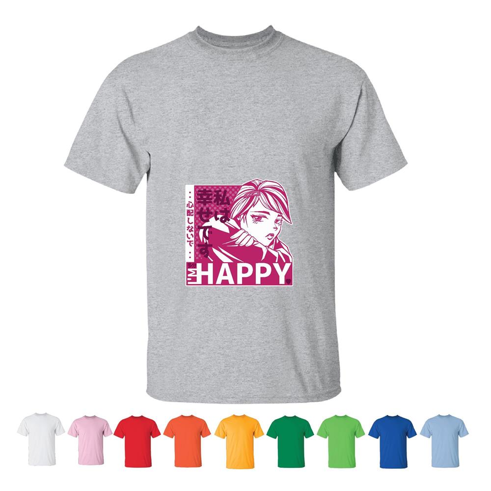 Tee Gift for Anime Fans Sad Anime Girl with I am Happy Caption for Teens and Adults Men Women White Gray T shirt