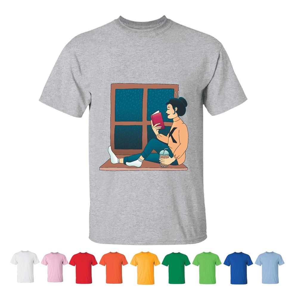 Tee Gift for Book Lovers Asian Girl Window Reading Woman Reading Book Next to Window Men Women White Gray T shirt