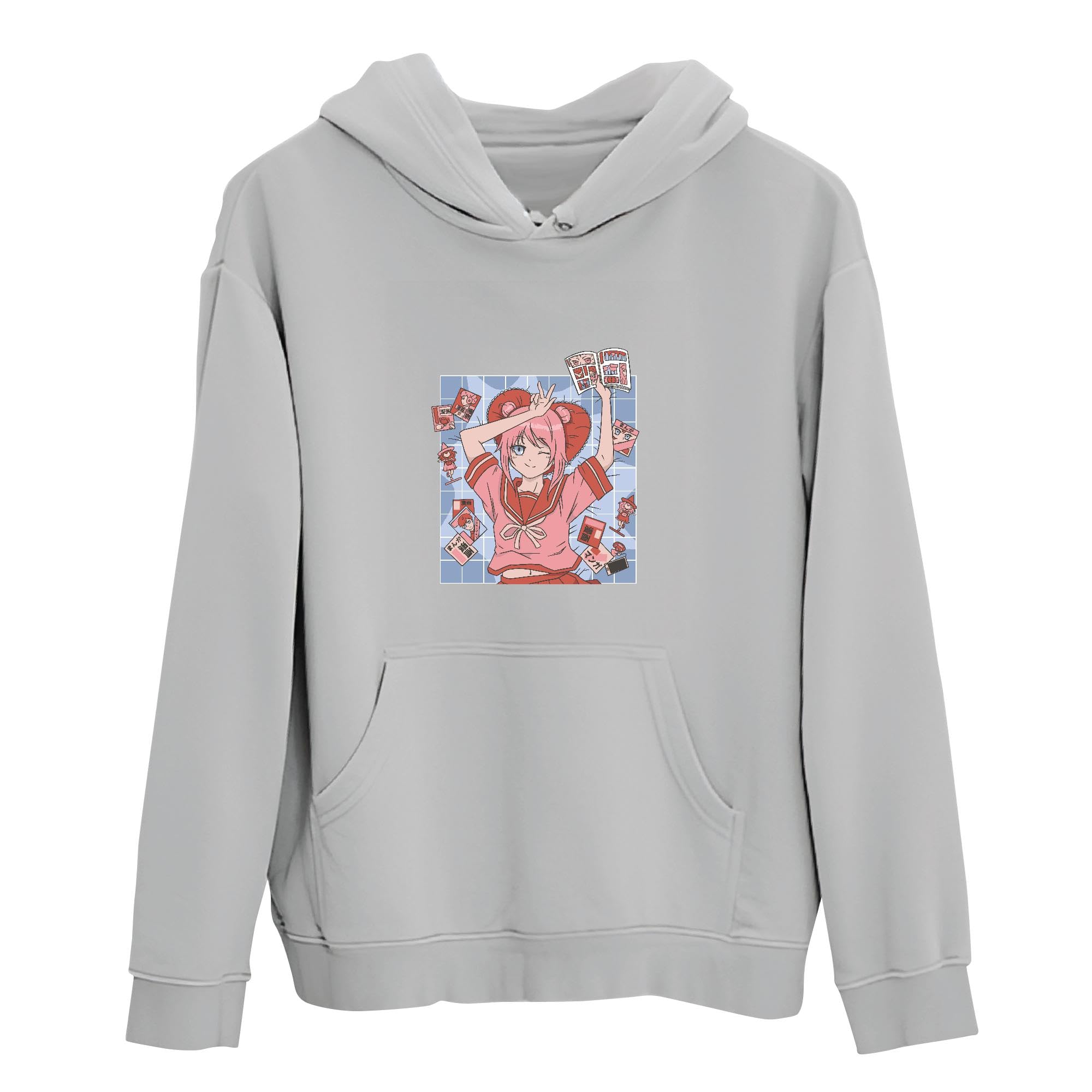 Tee Gift Idea for Anime and Comic Book Fans Anime Girl Surrounded by Comic Books Gray and Muticolor Unisex Hoodie