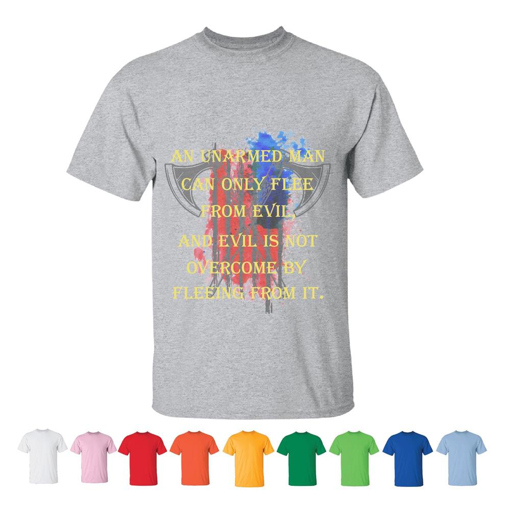 Tee Gift Idea for Men Who Protect from Evil Unarmed Man Fleeing vs Axe Gun Armed Men Men Women White Gray T shirt