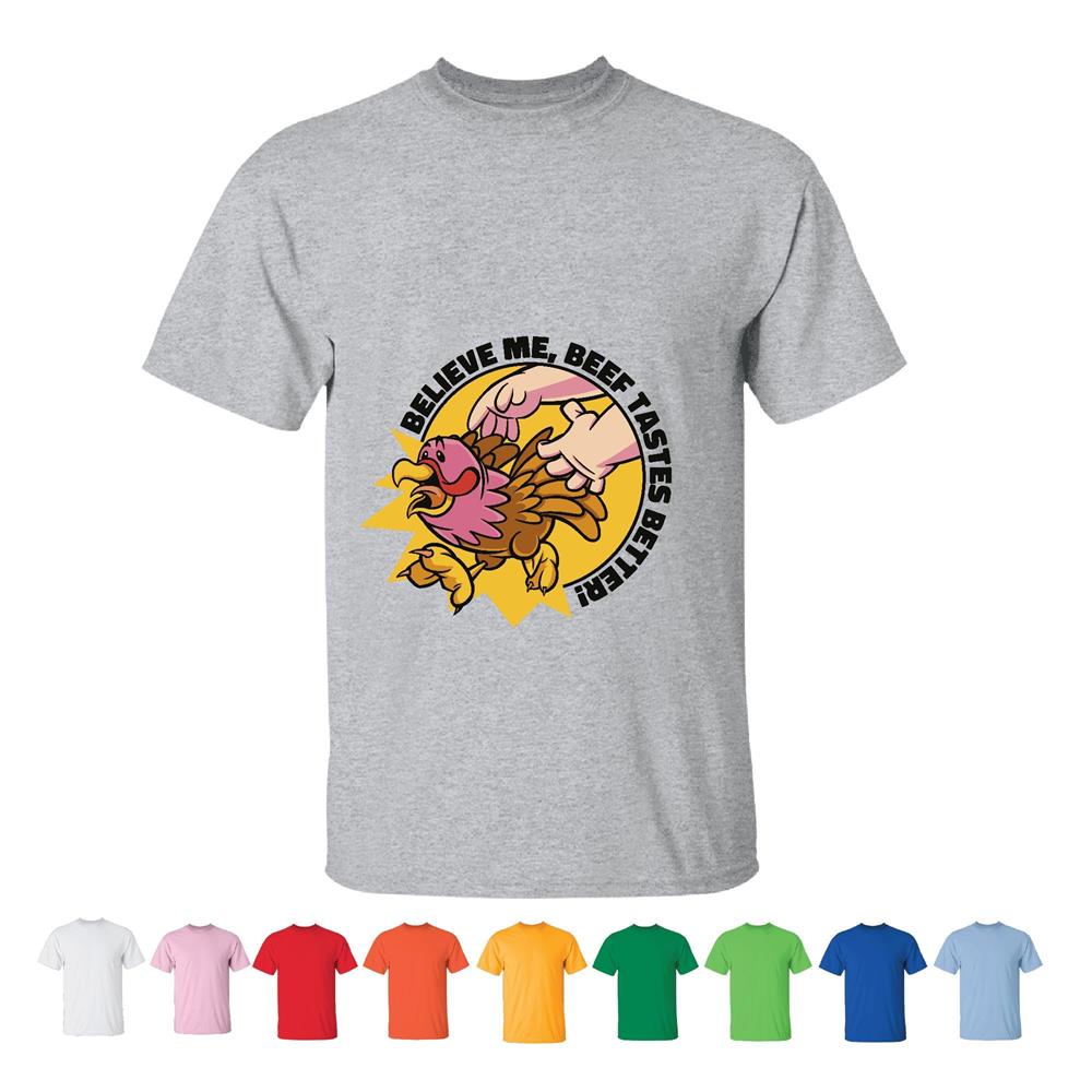 Thanksgiving Gift for Runners Cartoon Turkey with Quote Believe me Beef Tastes Better Men Women White Gray T shirt