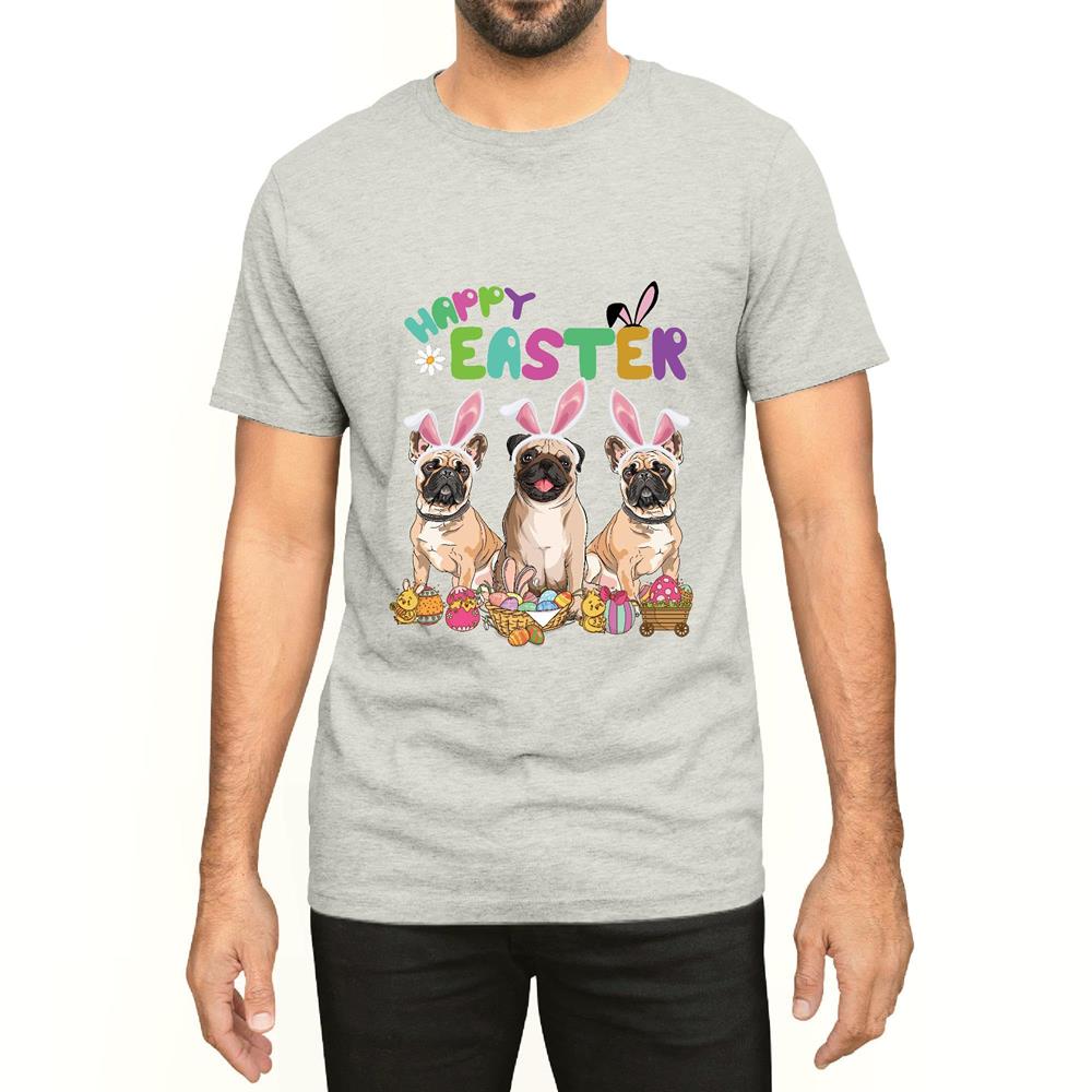 Three Pug Dog wearing Bunny Ear Pug Lover Happy Easter Day Men Women White Gray Multicolor T shirt