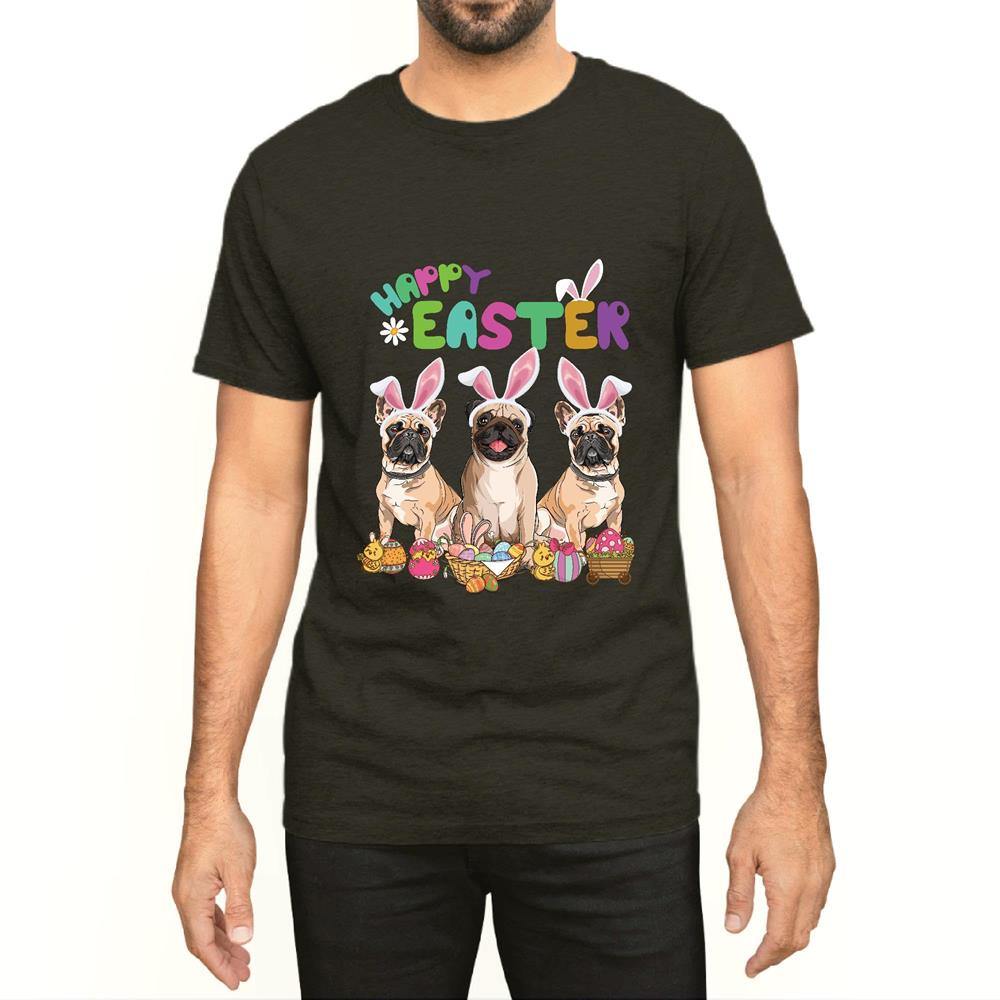 Three Pug Dog wearing Bunny Ear Pug Lover Happy Easter Day Men Women Black Multicolor T shirt