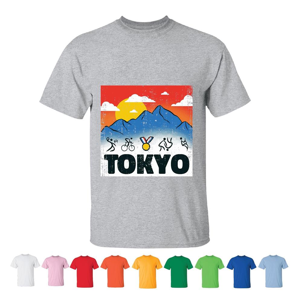 Tokyo Olympics Gift Sports Stick Figures on Mountain Background for Sports Fans Men Women White Gray T shirt