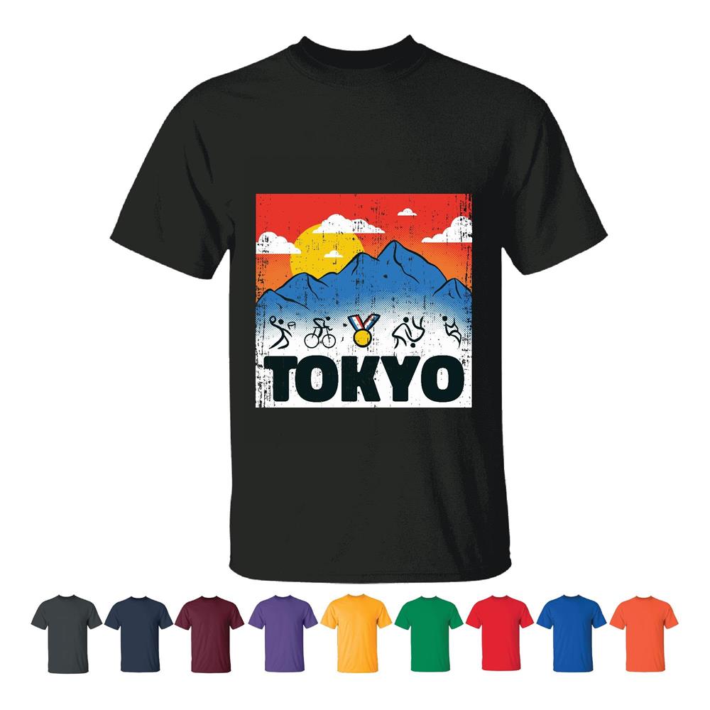 Tokyo Olympics Gift Sports Stick Figures on Mountain Background for Sports Fans Men Women Black T shirt