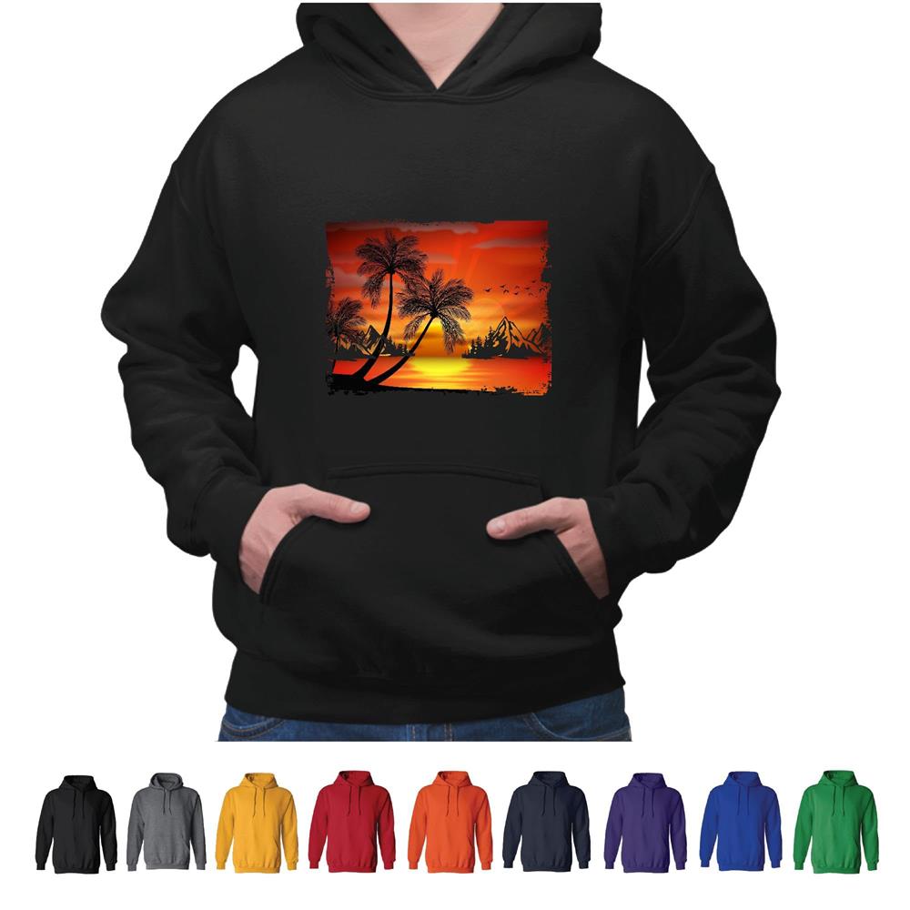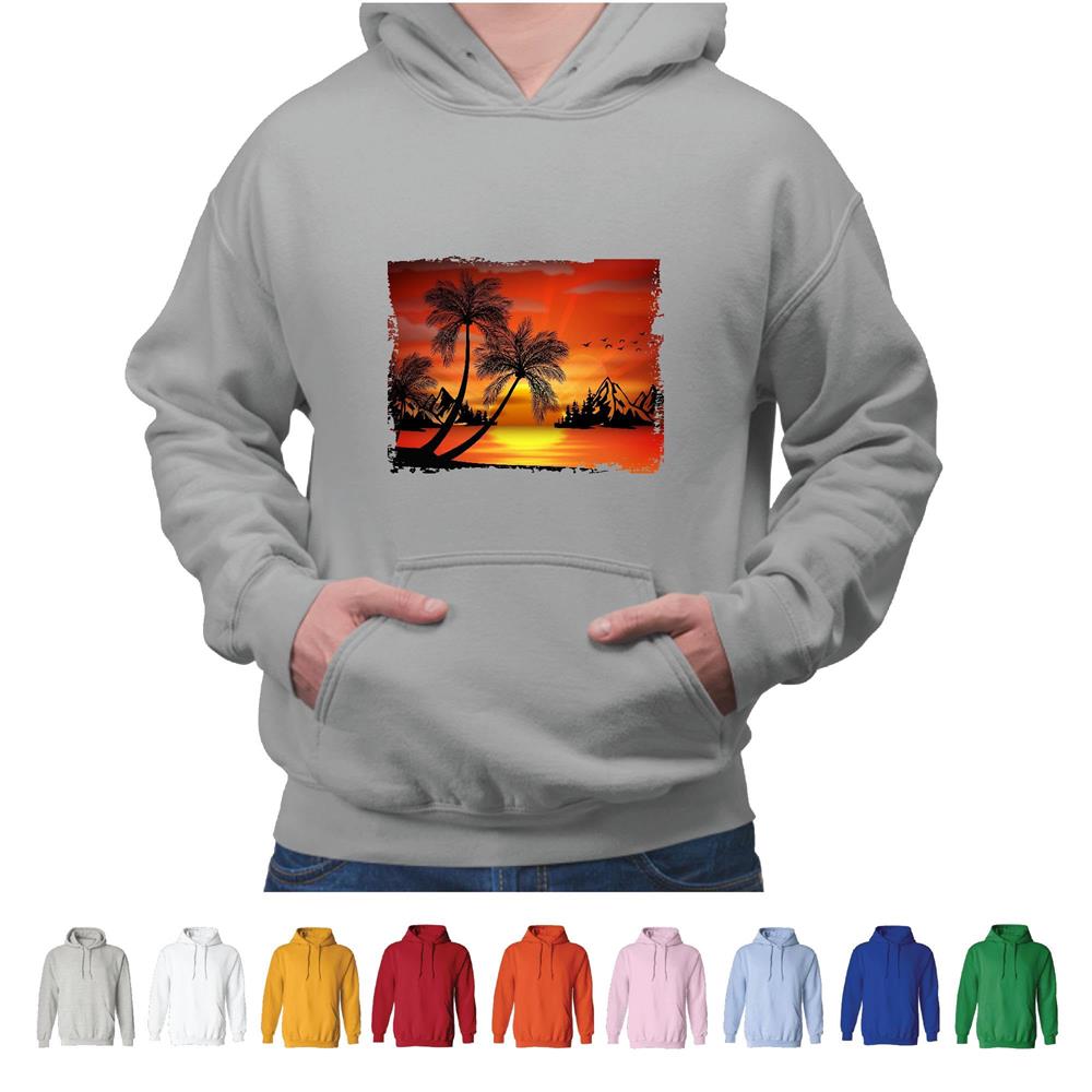 Tropical Sunset Mountains beach palm trees forest for in Summer vacation Gray and Muticolor Unisex Hoodie