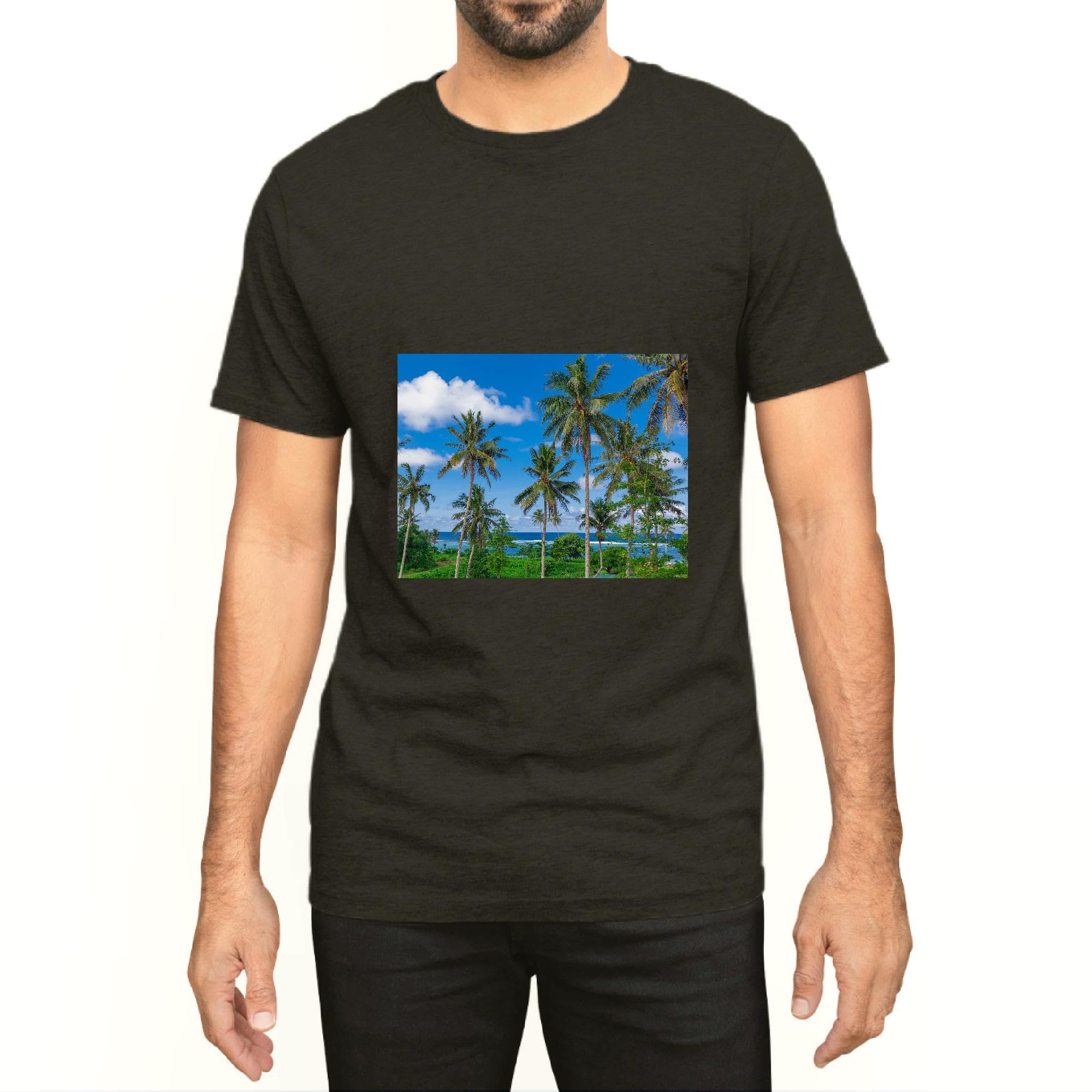 Tropical day Scene with Swaying Palm Trees and Glimpses of Blue Ocean Men Women Black Multicolor T shirt
