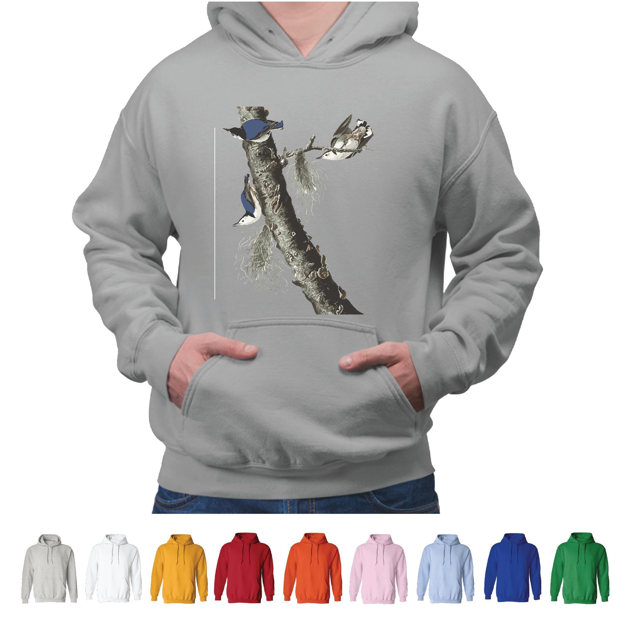 Unique Bird Gift for Nature Lovers White breasted Nuthatch Graphic Art Gray and Muticolor Unisex Hoodie