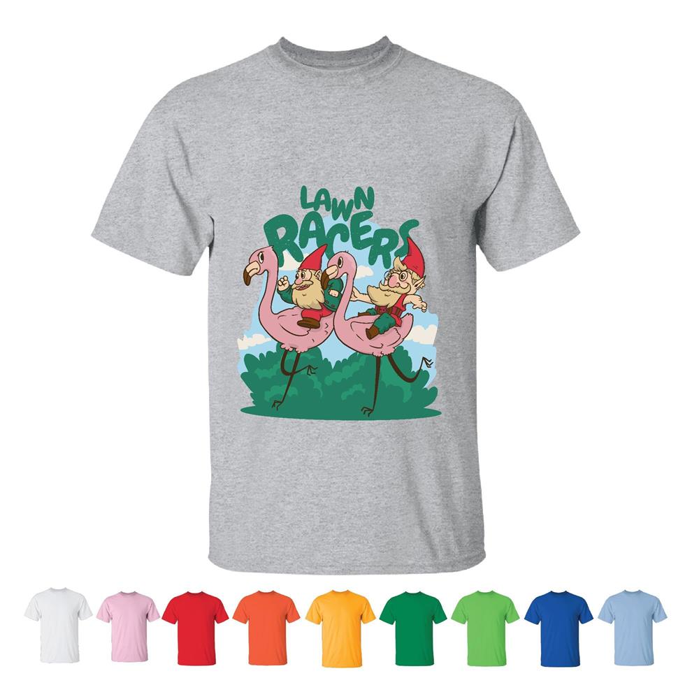 Unique Garden Gift Two Gnomes Riding Flamingos for Gardeners and Nature Lovers Men Women White Gray T shirt
