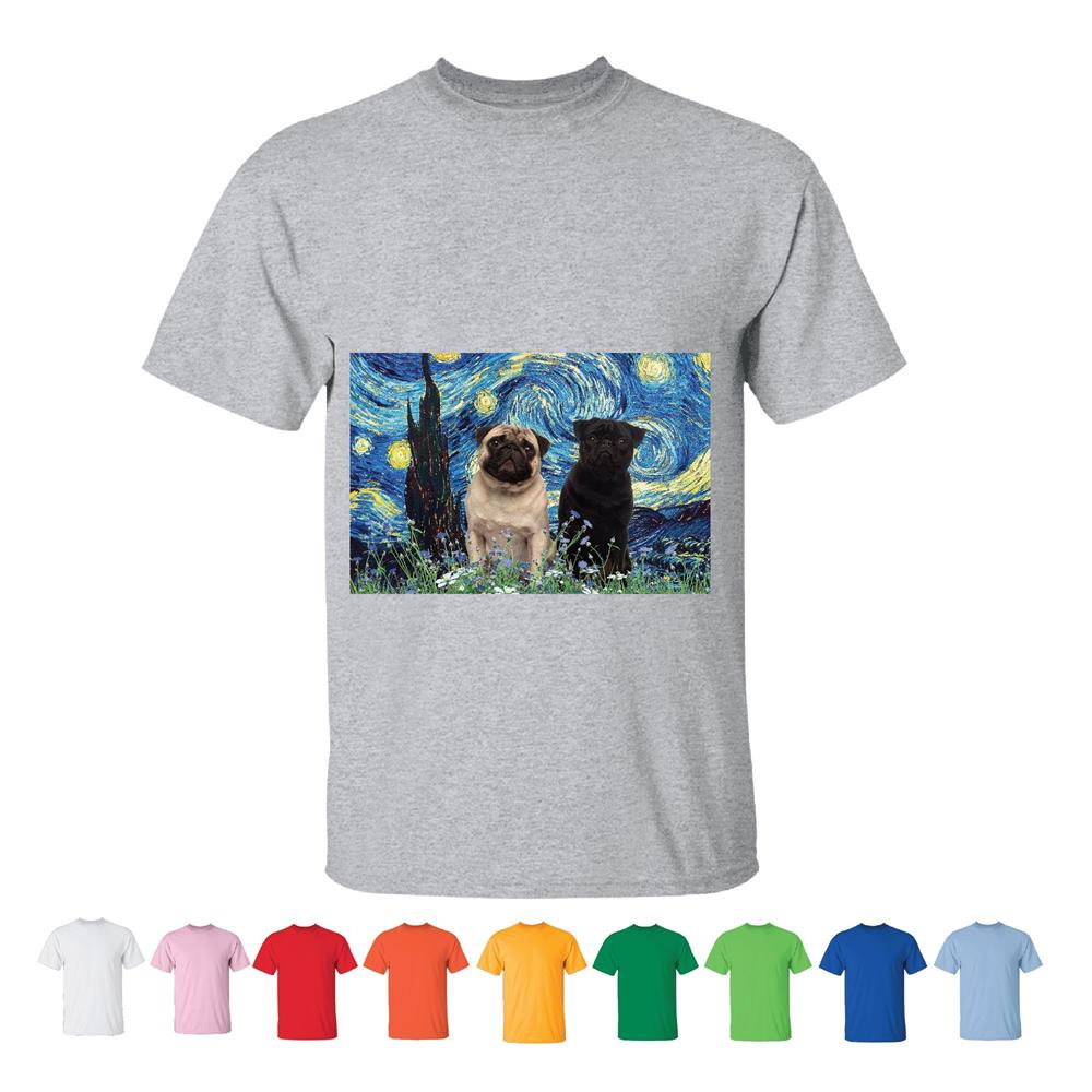 Unique Gift for Pug Lovers Starry Night and Pug Pair White Black Men Women White Gray T shirt