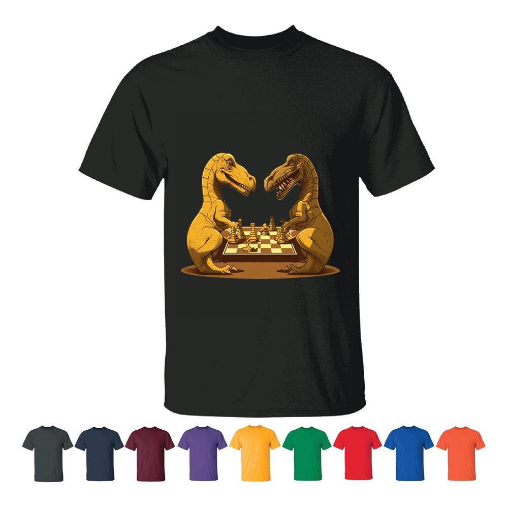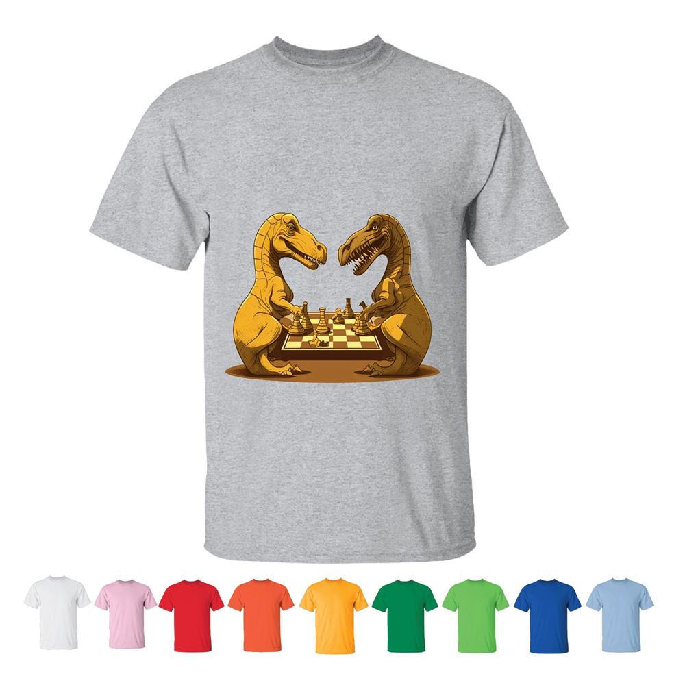 Unique Gift Idea for Chess Grandmasters – Two Dinosaurs Playing Men Women White Gray T shirt