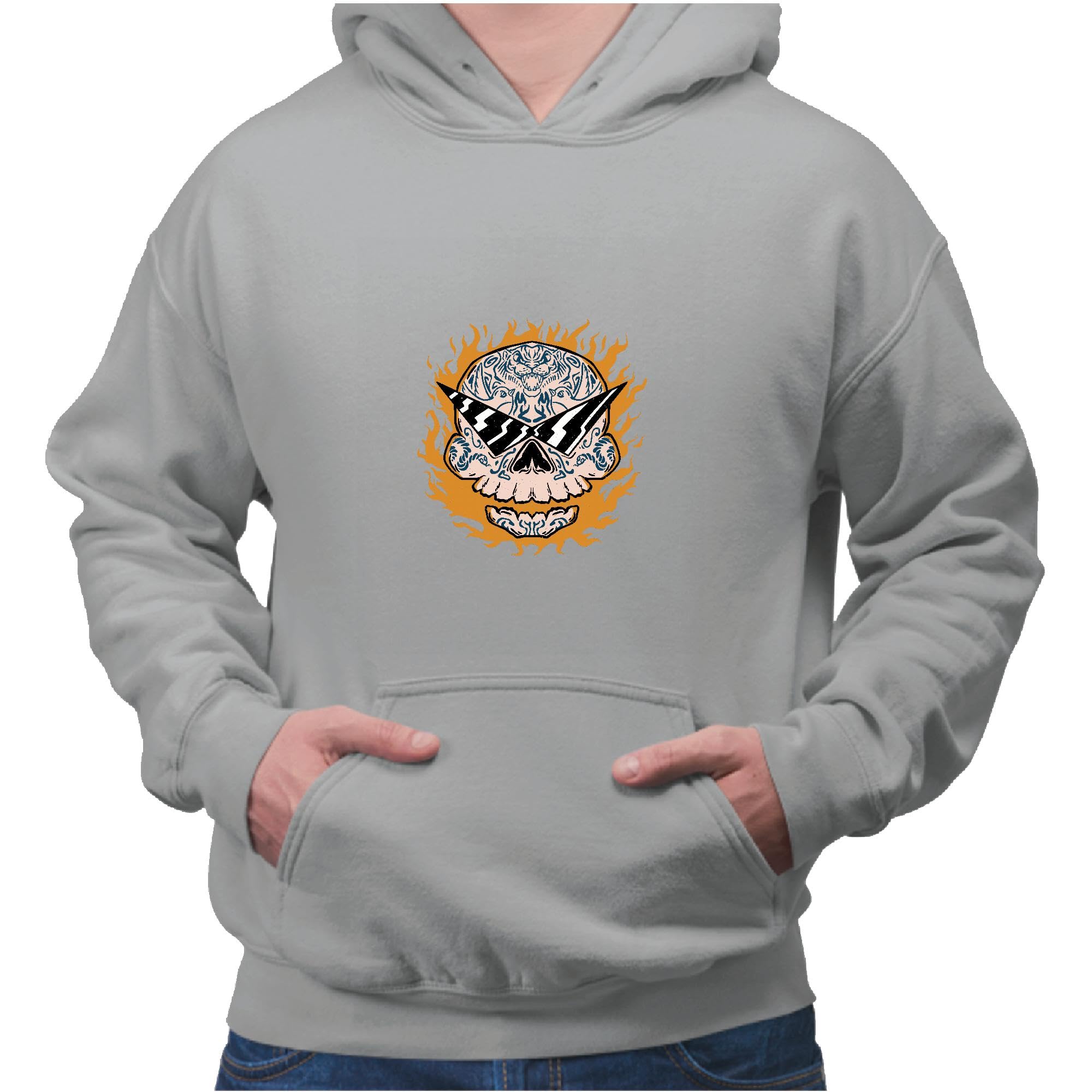 Unique Gift Idea for Men Skull with Tiger Tattoo and Flames for Birthdays and Holidays Gray and Muticolor Unisex Hoodie