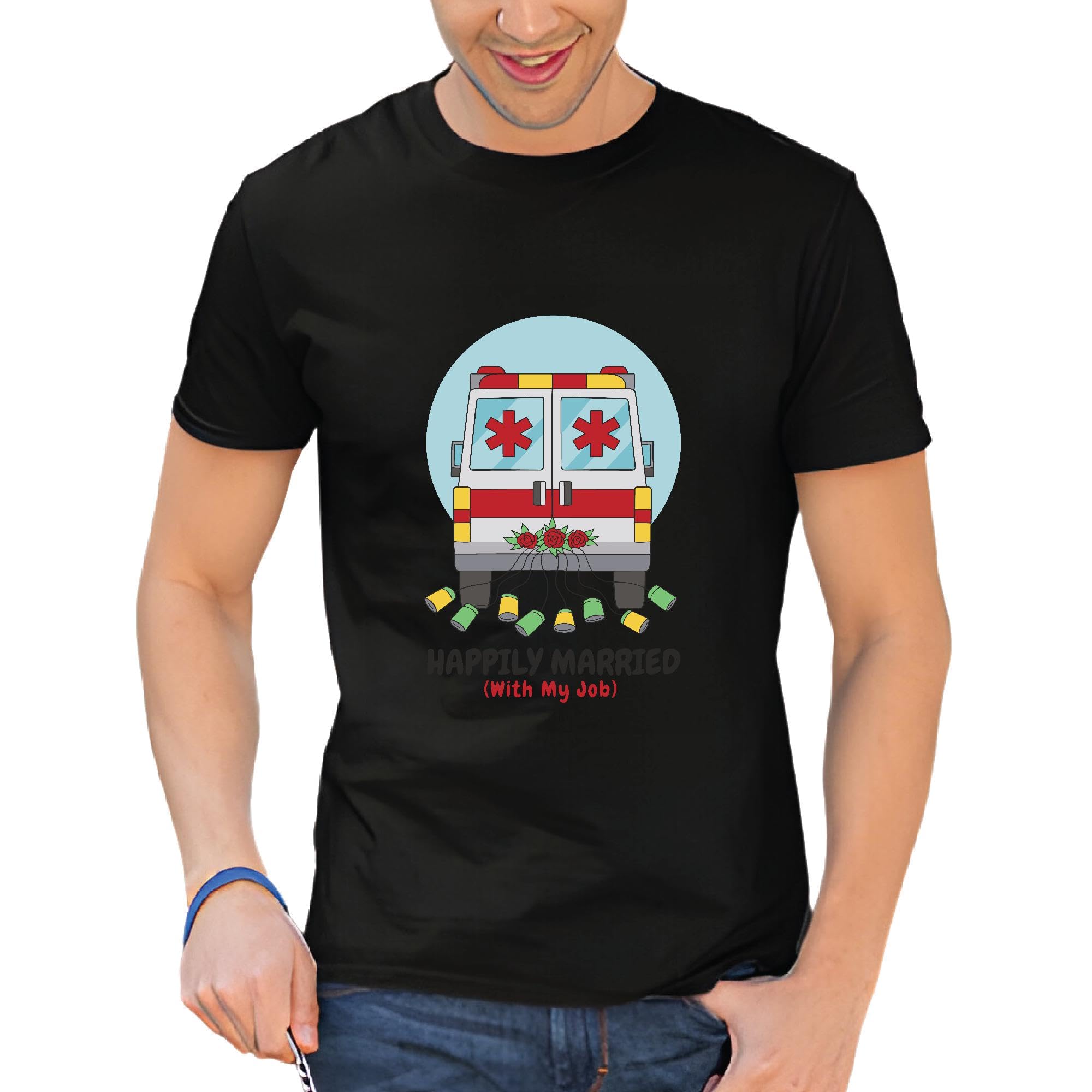 Unique Gift Idea for Paramedics and EMTs Ambulance Artwork Happily Married with my Job Men Women Black Multicolor T shirt
