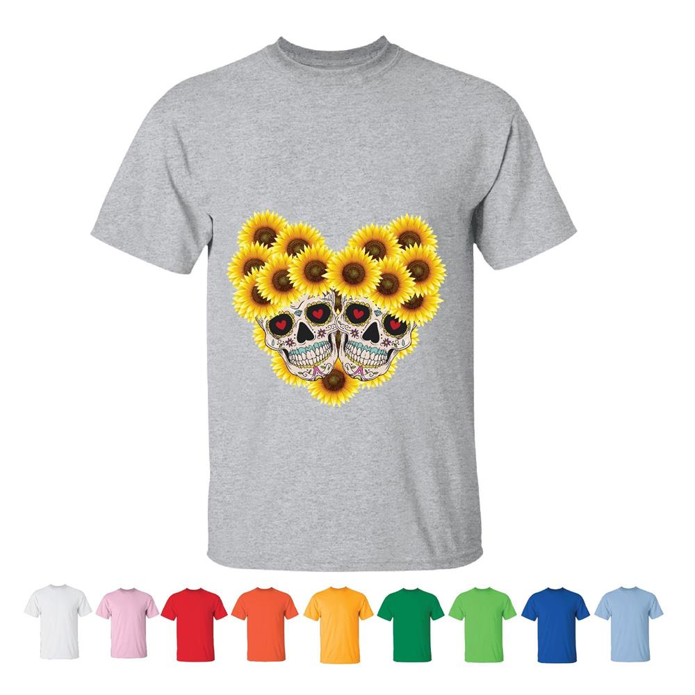 Unique Gift Idea for Skulls and Sunflowers Lovers Men Women White Gray T shirt