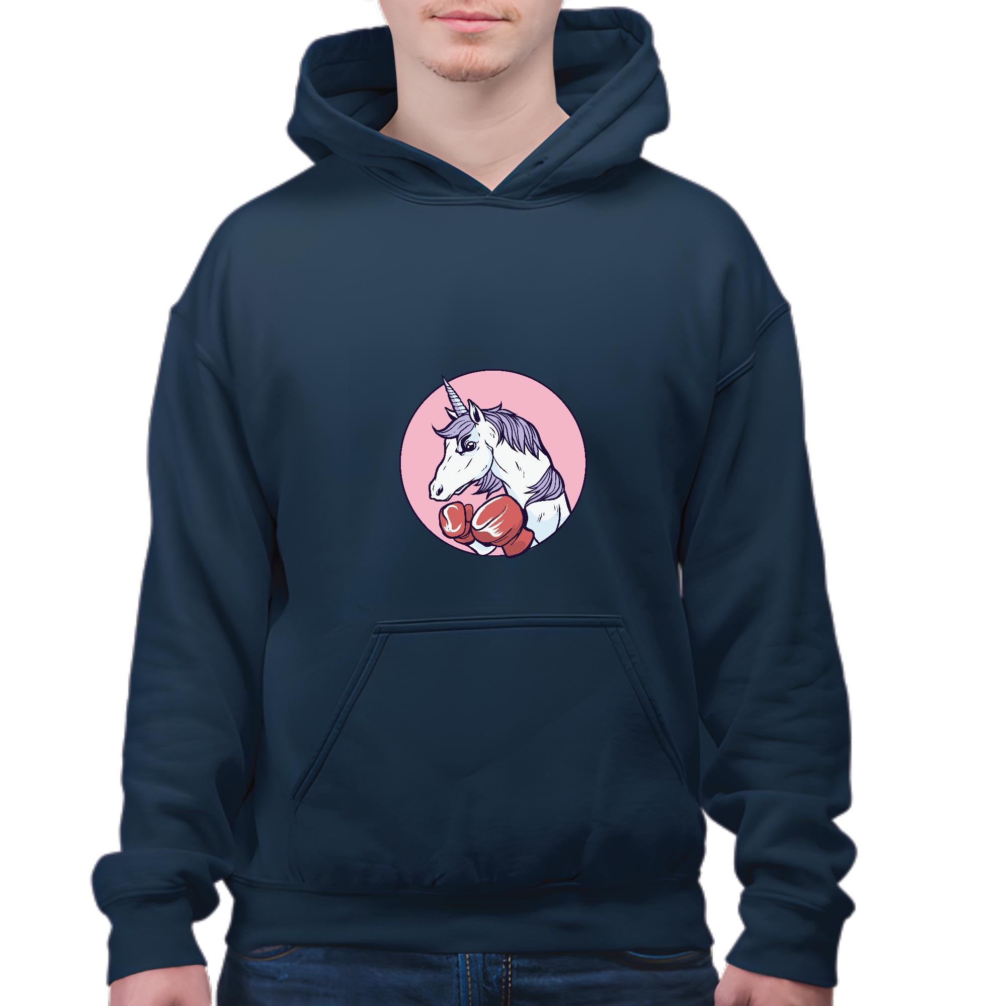 Unique Gift Idea for Unicorn Lovers Angry Unicorn Boxing Illustration Navy and Muticolor Unisex Hoodie