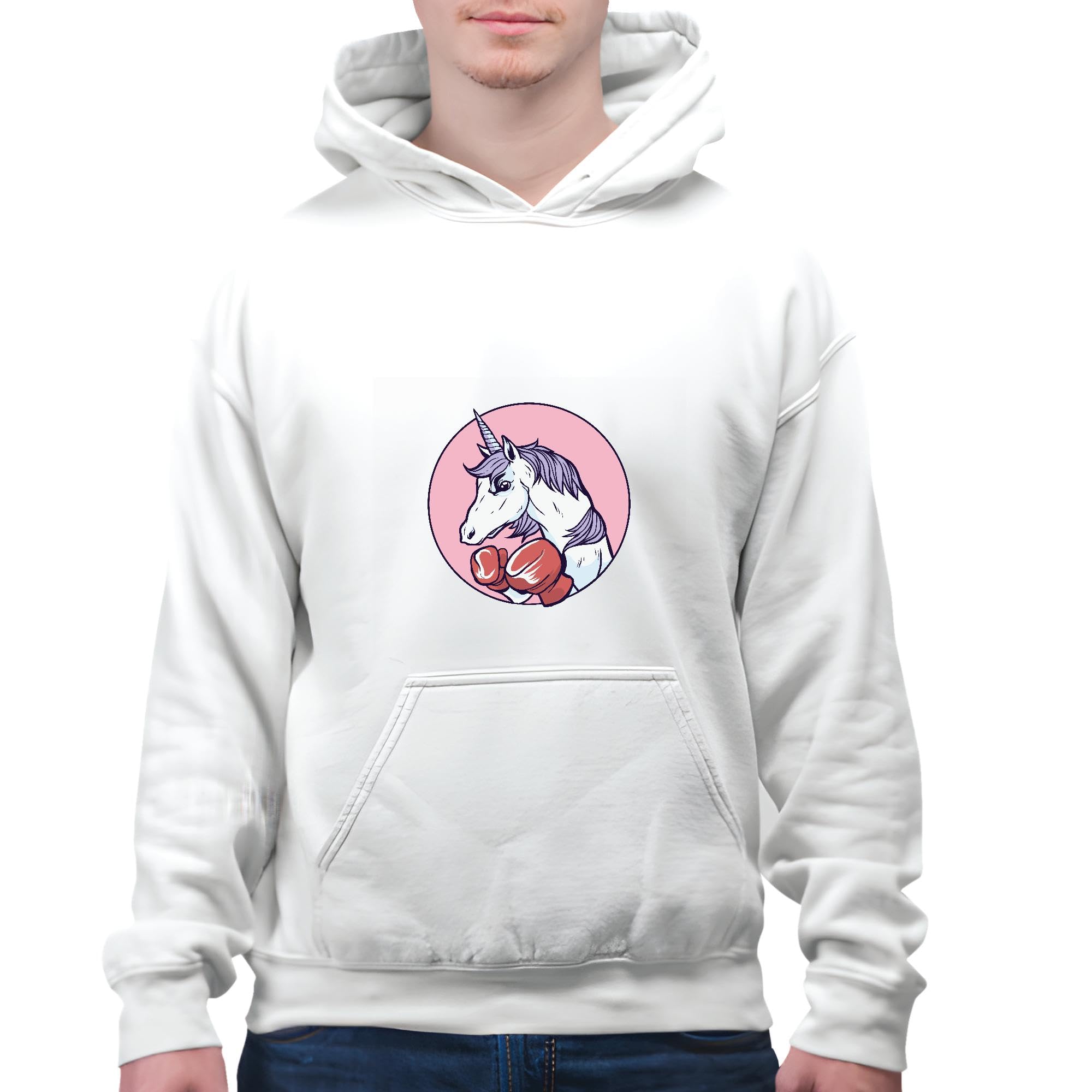 Unique Gift Idea for Unicorn Lovers Angry Unicorn Boxing Illustration White and Muticolor Unisex Hoodie