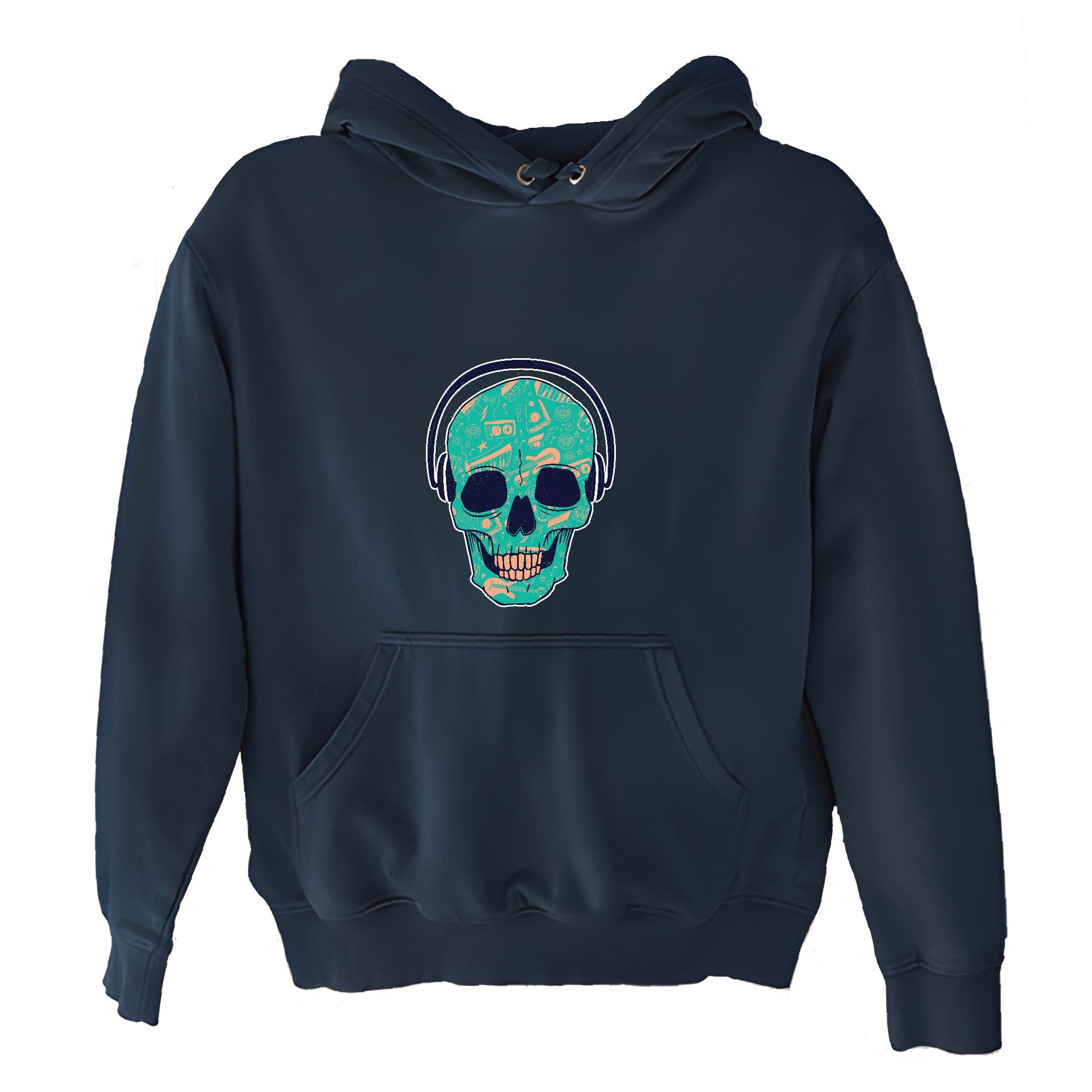 Unique Gift Idea Hand Drawn Skull with Headphones Illustration For Music Enthusiasts Navy and Muticolor Unisex Hoodie