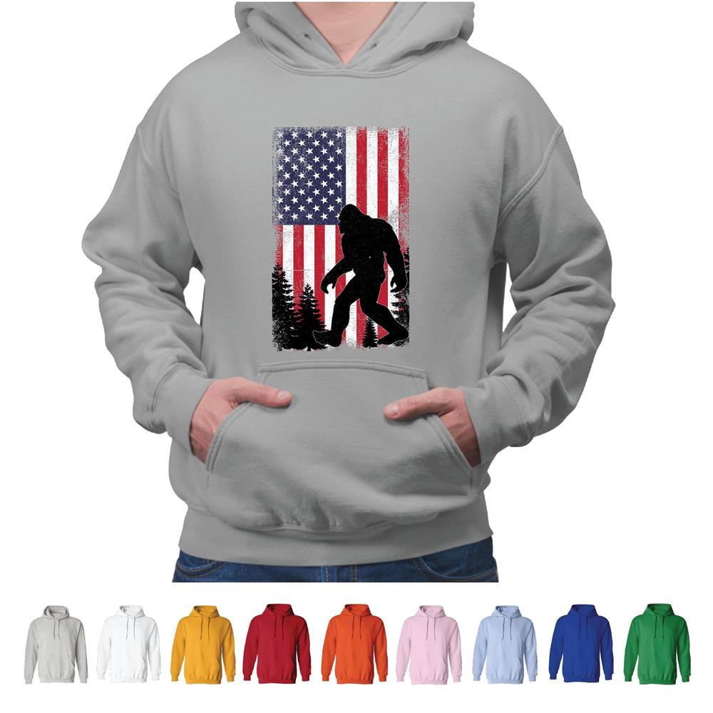 USA Flag Bigfoot Sasquash Graphic Gift for Men Women Kids Gray and Muticolor Unisex Hoodie