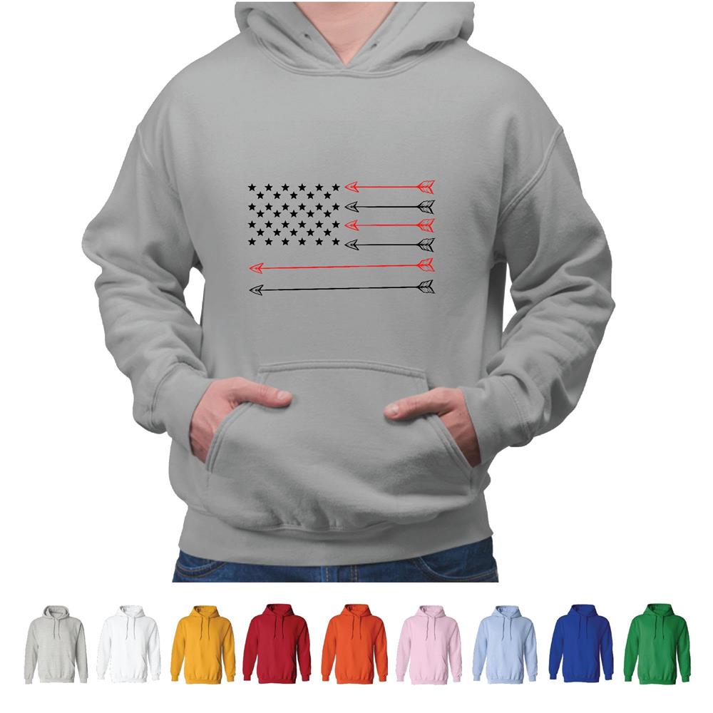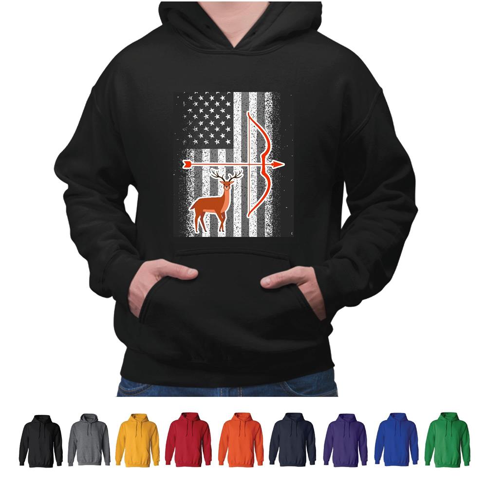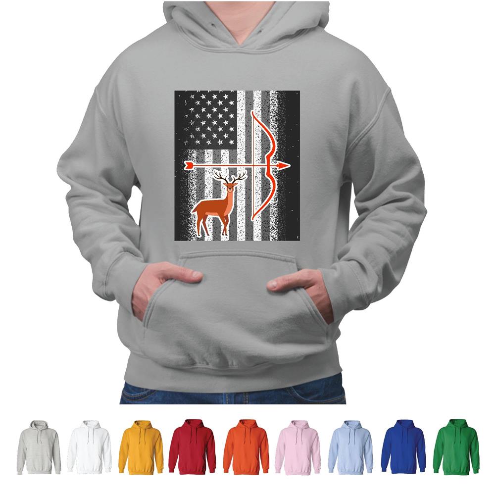 USA Flag Bowhunting Gift for Huntsman Deer Buck Arrow Gray and Muticolor Unisex Hoodie