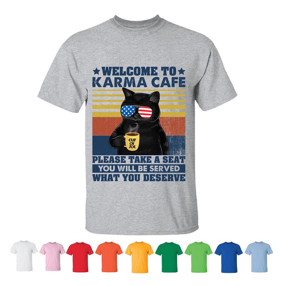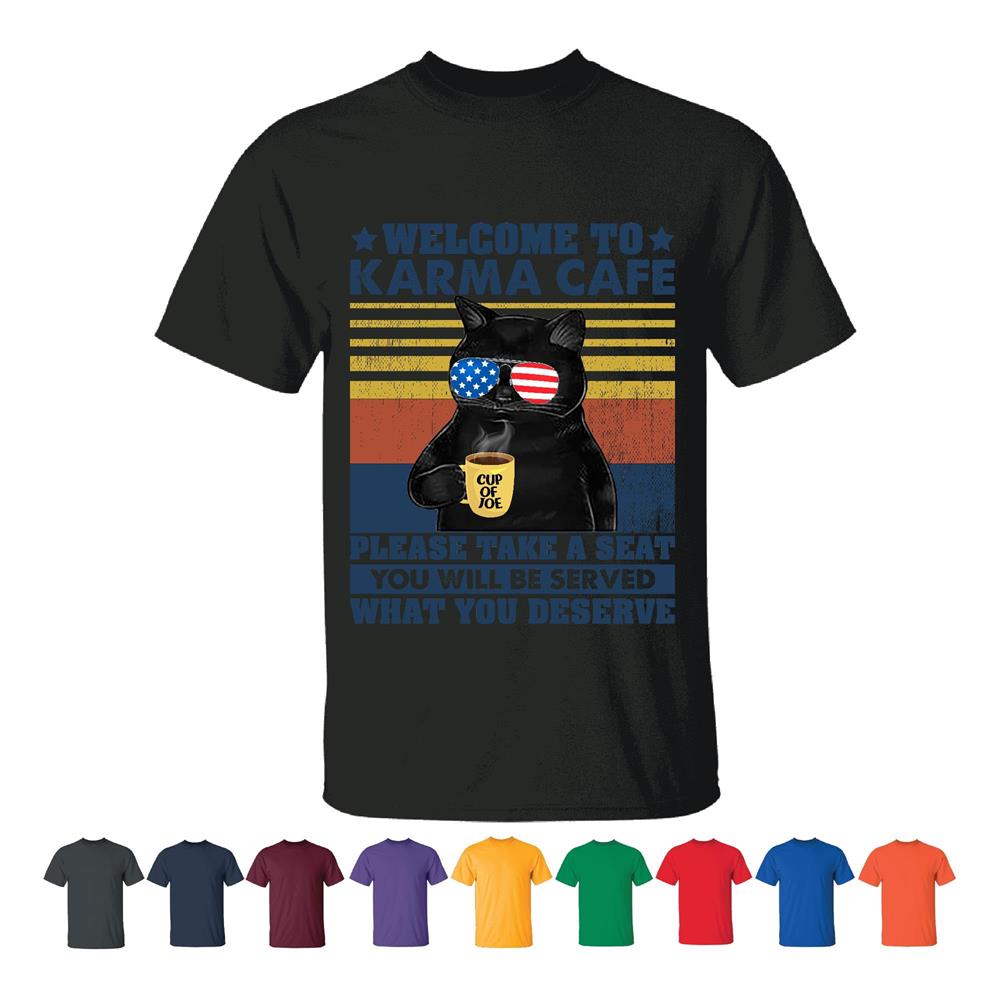 USA Flag Cat Welcome Karma Cafe Seating Service Deserve Men Women Black T shirt
