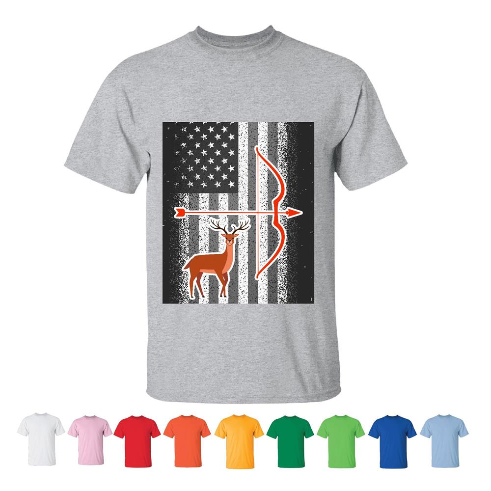 USA Flag Bowhunting Gift for Huntsman Deer Buck Arrow Men Women White Gray T shirt