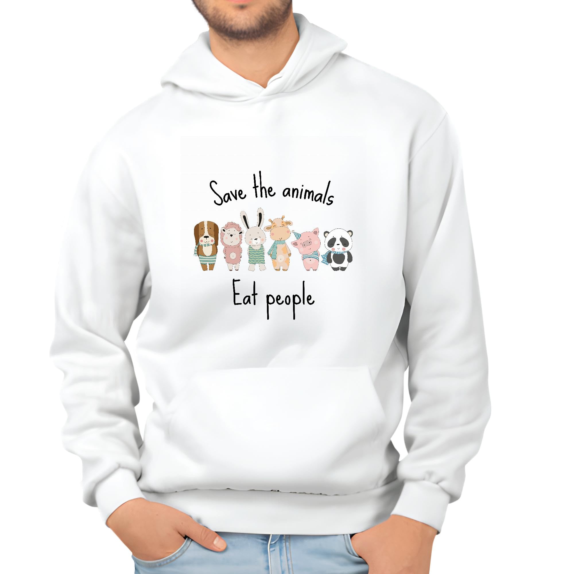 Vegan Idea Save Animals Eat People Sarcasm Be Vegetarian Keep Balance World White and Muticolor Unisex Hoodie