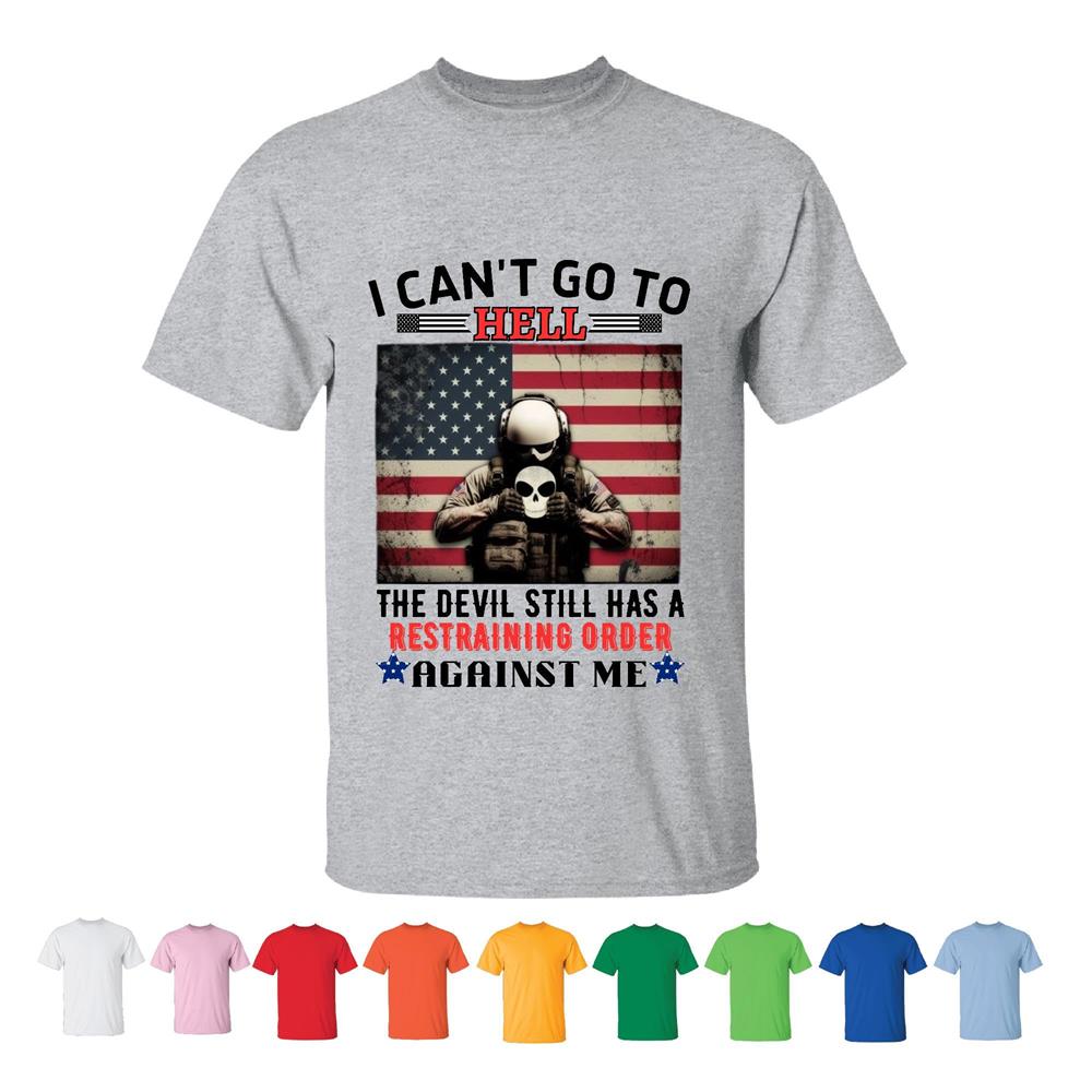Veterans Gift Ideas for Friends I Cant Go to Hell Devil Restraining Order Men Women White Gray T shirt