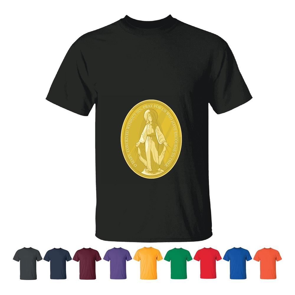 Virgin Mary Medal Gift for Catholics Inspirational Quote on Gold Plated Medal Men Women Black T shirt