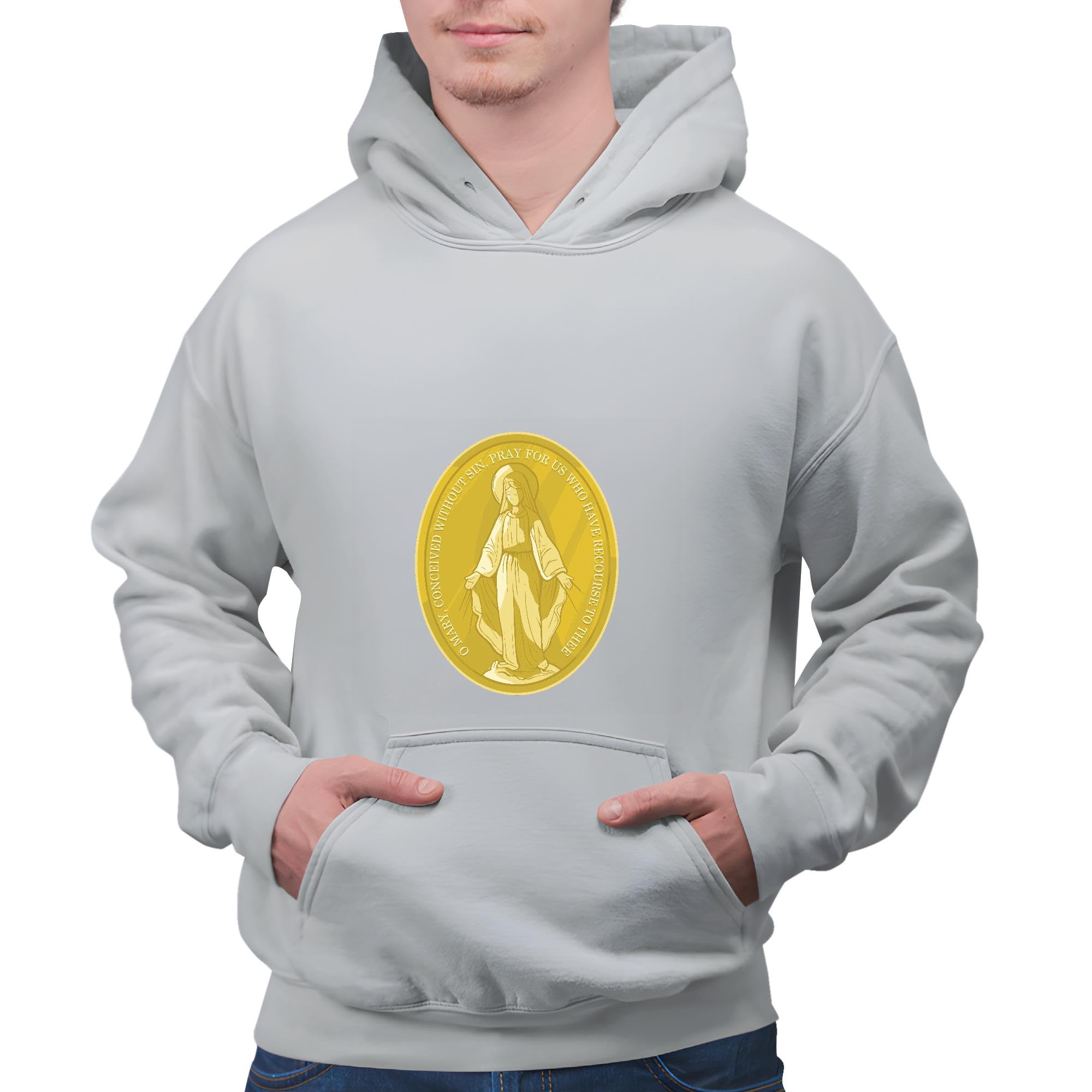 Virgin Mary Medal Gift for Catholics Inspirational Quote on Gold Plated Medal Gray and Muticolor Unisex Hoodie