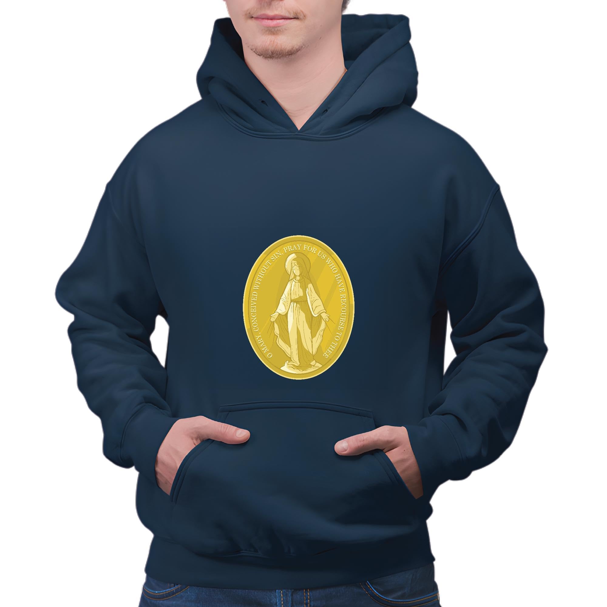 Virgin Mary Medal Gift for Catholics Inspirational Quote on Gold Plated Medal Navy and Muticolor Unisex Hoodie