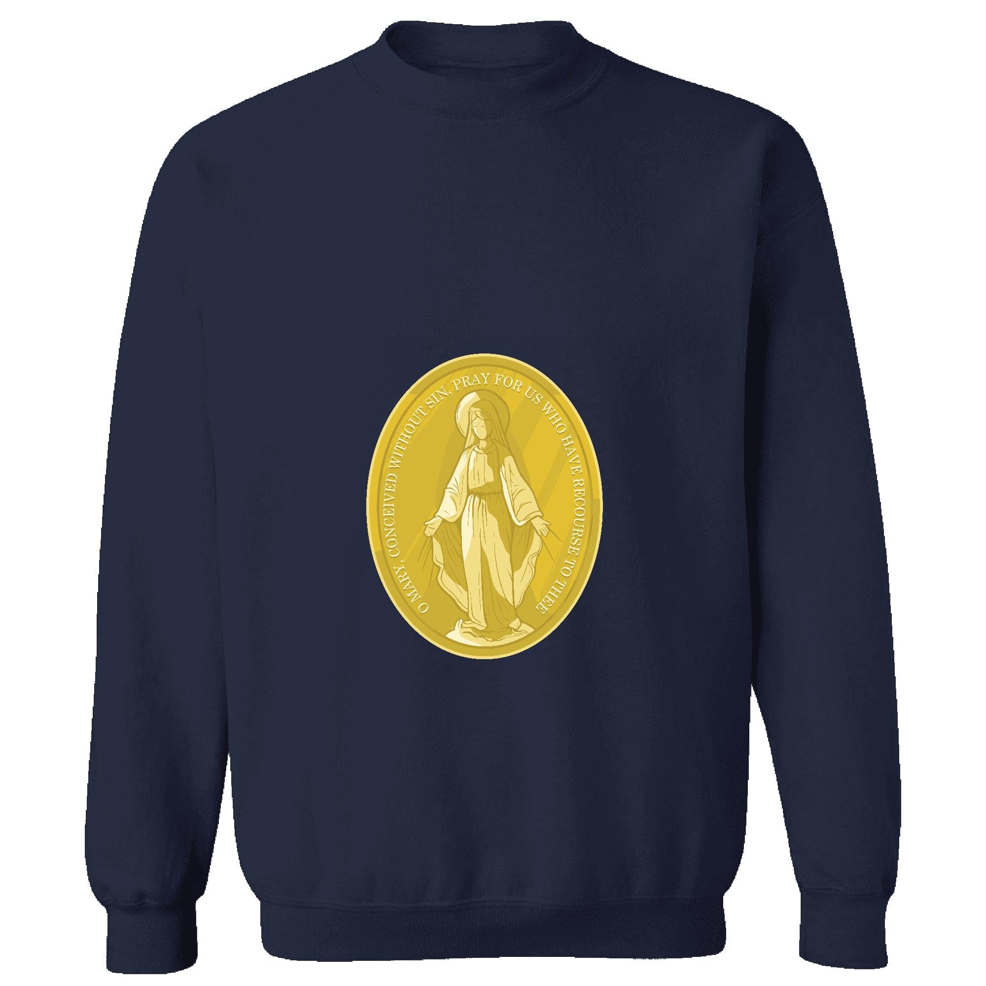 Virgin Mary Medal Gift for Catholics Inspirational Quote on Gold Plated Medal Navy Muticolor Unisex Sweatshirt