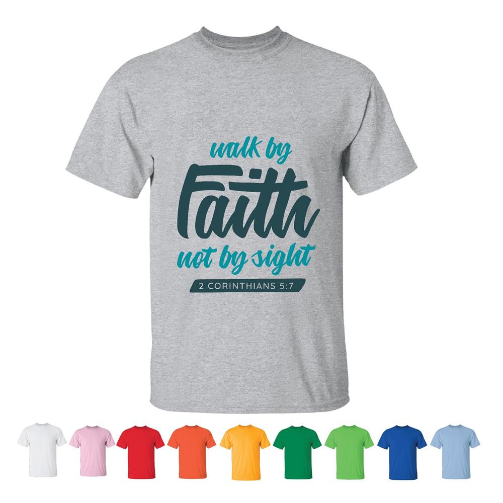 Walk By Faith Christian Gift Inspirational Quote for Believers Men Women White Gray T shirt