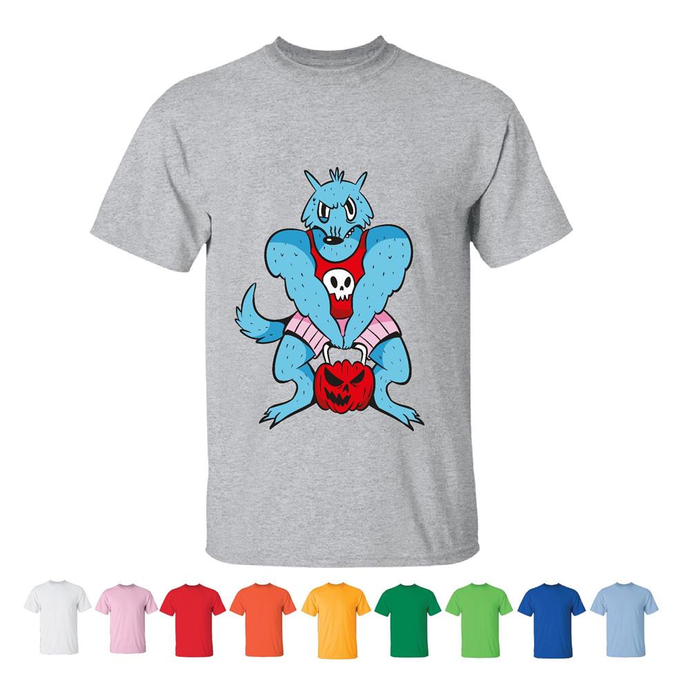 Werewolf Gym Gift Cartoon Werewolf Lifting Pumpkin Weight for Fitness Lovers Men Women White Gray T shirt