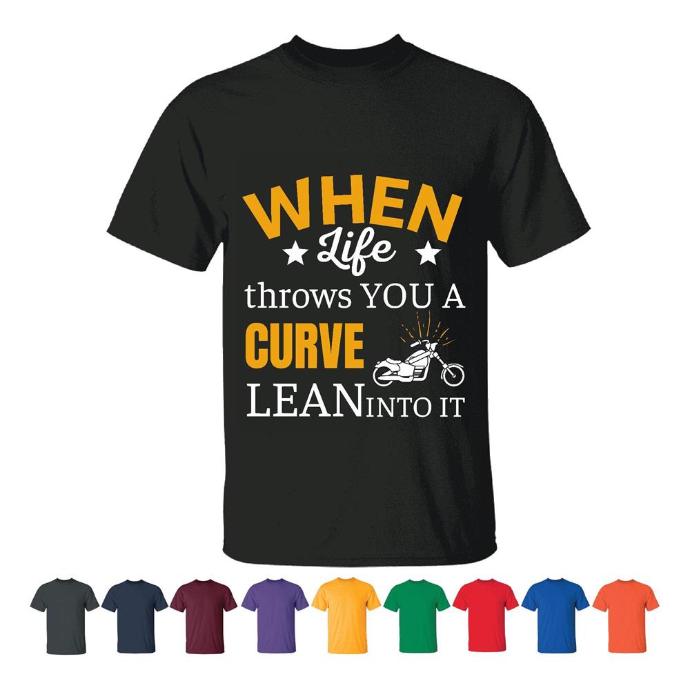 When life throws you a curve lean into it humor saying for Motorcycle Motorbiker Men Women Black T shirt