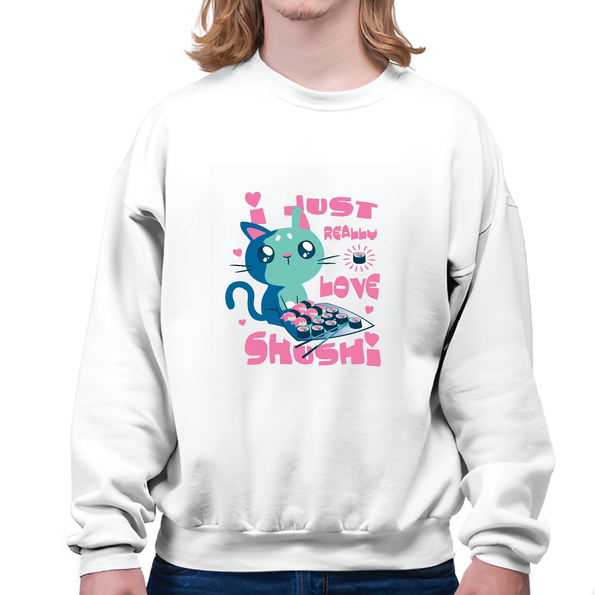 Kawaii Cat Eating Sushi Seafood Gift for Cat Lovers Grey White Muticolor Unisex Sweatshirt
